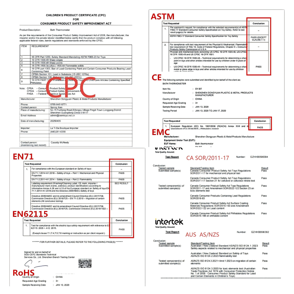 EN71/CE/ROHS/EMC/CPSC/REACH/ASTM/EN62115