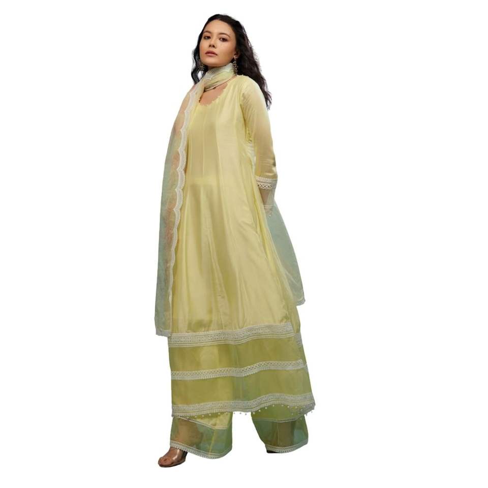 ชุดสูทพาลาซโซสีเหลืองลายดอกแดฟโฟดิลผ้าไหมวิสคอสเสื้อผ้าพื้นเมืองสำหรับผู้หญิงเครื่องแต่งกายตามเทศกาลออกแบบได้ตามต้องการ