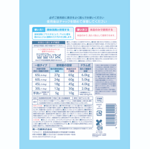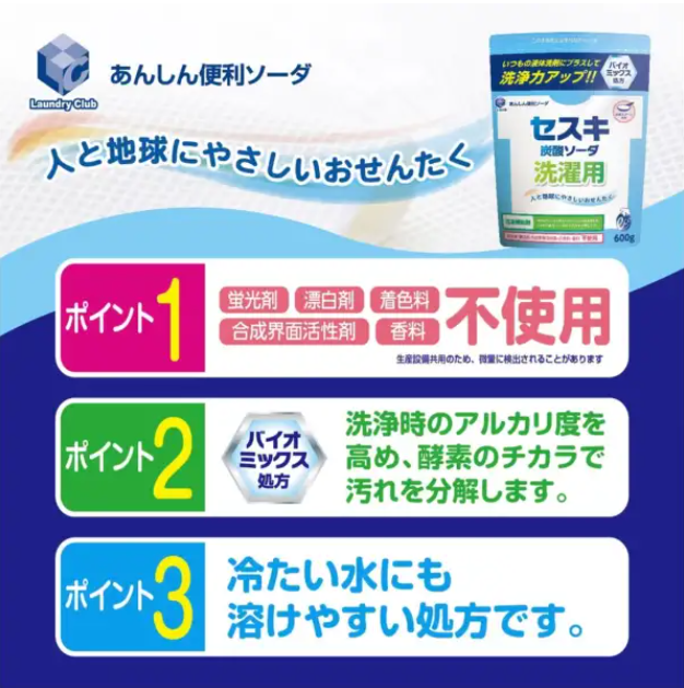 ผงซักฟอกไดอิจิ เซ็คเคน เนเชอรัล ลอนดรี้ คลับ เซสกี คาร์บอเนต 600 กรัม ผลิตในประเทศญี่ปุ่น มีส่วนผสม 30-50%