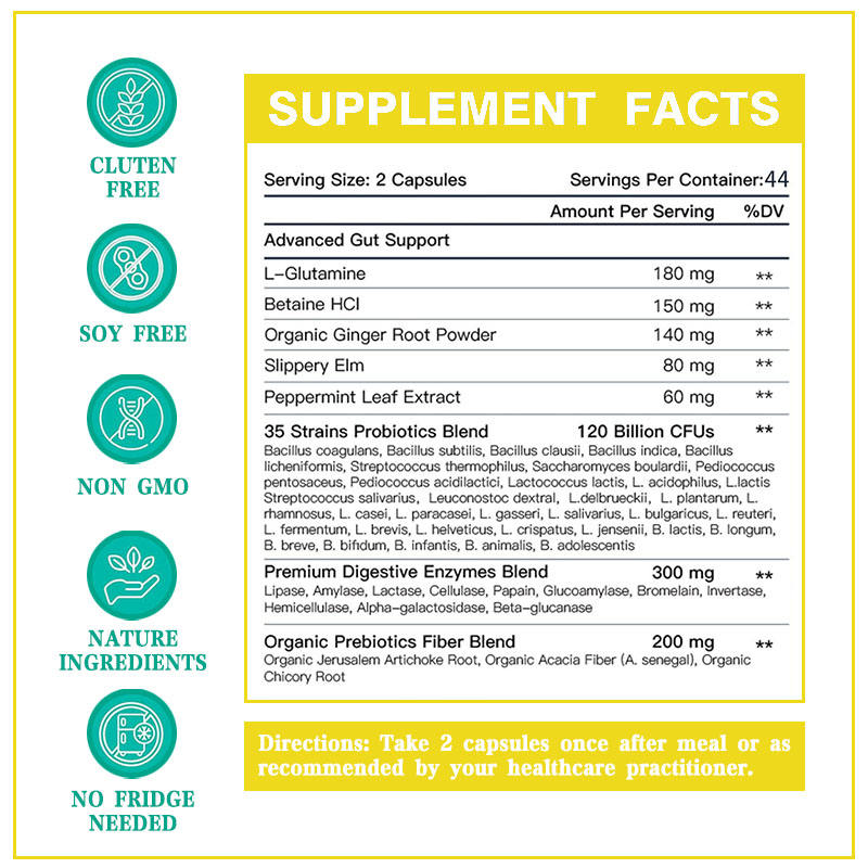ส่วนผสมหลัก:แอล-กลูตามีน, เบทาอีน เอชซีแอล, เอล์มลื่น, สารสกัดจากใบเปปเปอร์มินต์, โพรไบโอติกส์ผสม 35 สายพันธุ์, ส่วนผสมเอนไซม์ย่อยอาหารคุณภาพพรีเมียม