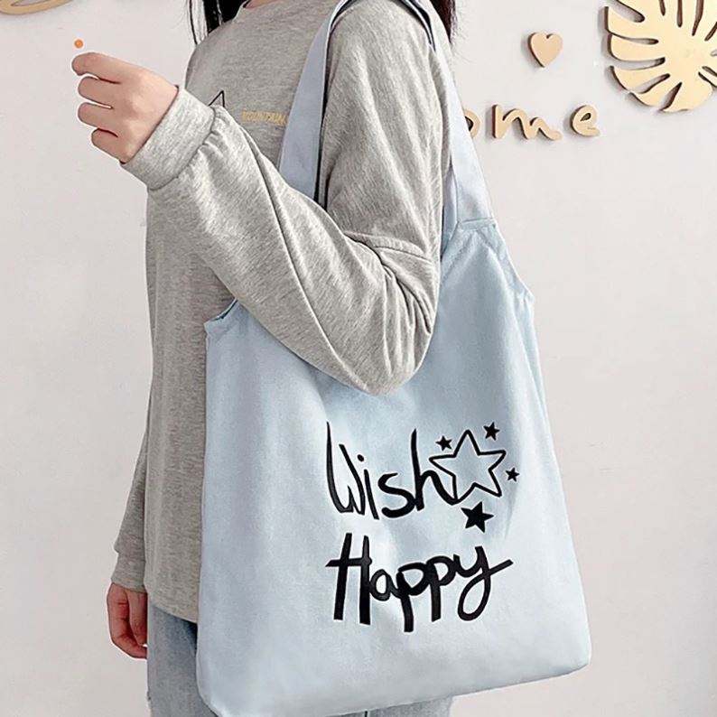 กระเป๋าผ้าแคนวาสแบบเรียบง่ายรักษ์โลกพร้อมหูหิ้วเชือก ใช้ซ้ำได้สำหรับการเดินทางและพิมพ์ลายตัวอักษร