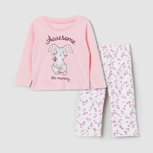 ชุดนอนเด็กผู้หญิงผ้าฝ้ายแขนยาวสีชมพูและกางเกงสีขาวลายสัตว์ & ดอกไม้ชุดใส่อยู่บ้านสำหรับฤดูร้อน