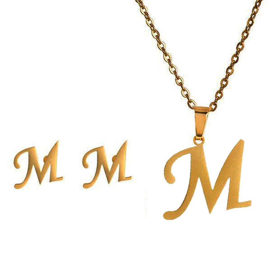 Dainty ชุดเครื่องประดับเริ่มแรกทุน,ชุดต่างหูสตั๊ดสร้อยคอจี้ตัวอักษรขนาด26ตัวอักษรสีทองสเตนเลสสตีล
