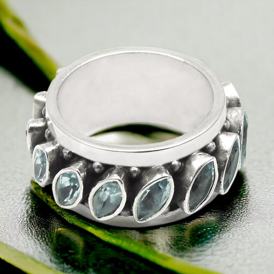 ของขวัญที่สวยงามสำหรับเธอ925สเตอริงเงินธรรมชาติสีฟ้าบุษราคัมแหวนทรงกลมทำมือเครื่องประดับขายส่ง