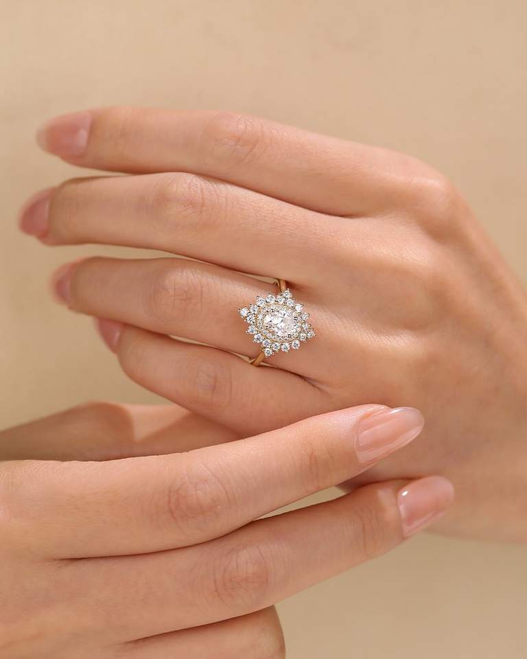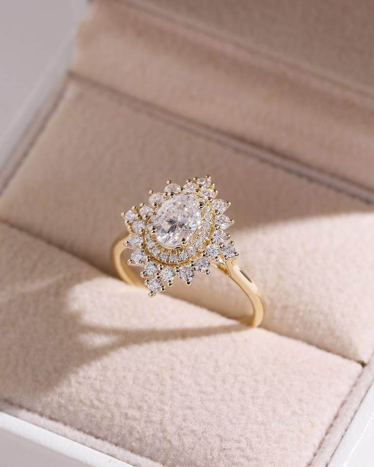 Dainty Oval Moissanite Diamond Engagement Ring with Sunburst Halo Style in 14K Yellow Gold Statement Anniversary Gift For Her