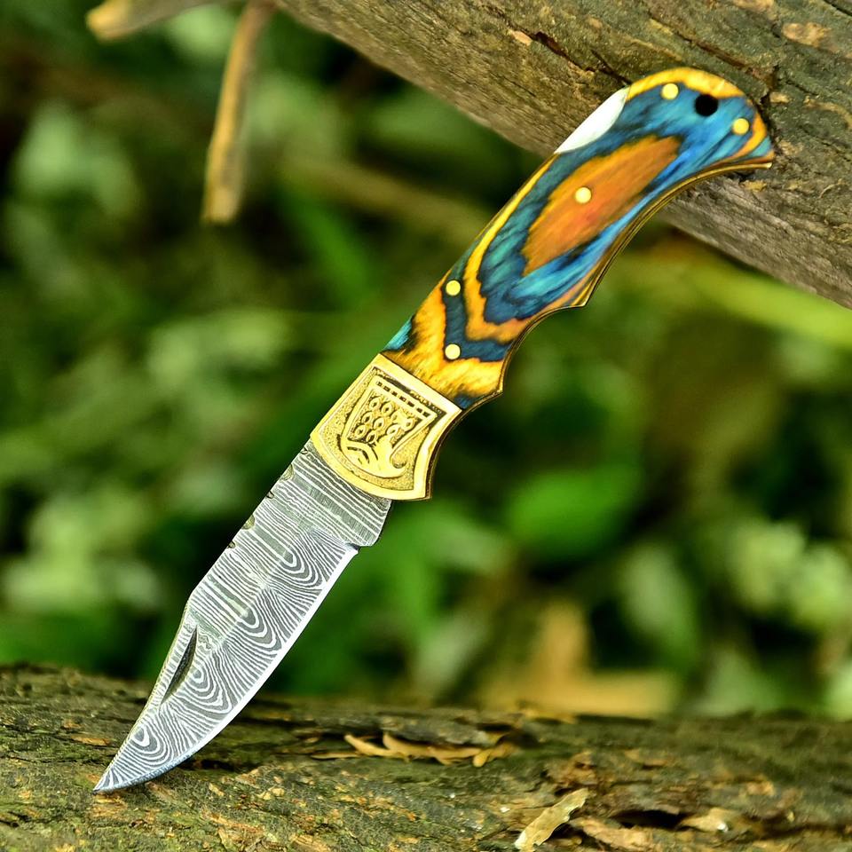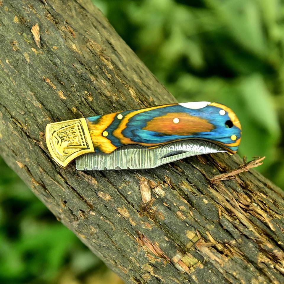 มีดพับทำมือ Damascus Custom OEM พร้อมด้ามสลักลาย มีดพกพาพร้อมปลอกหนัง