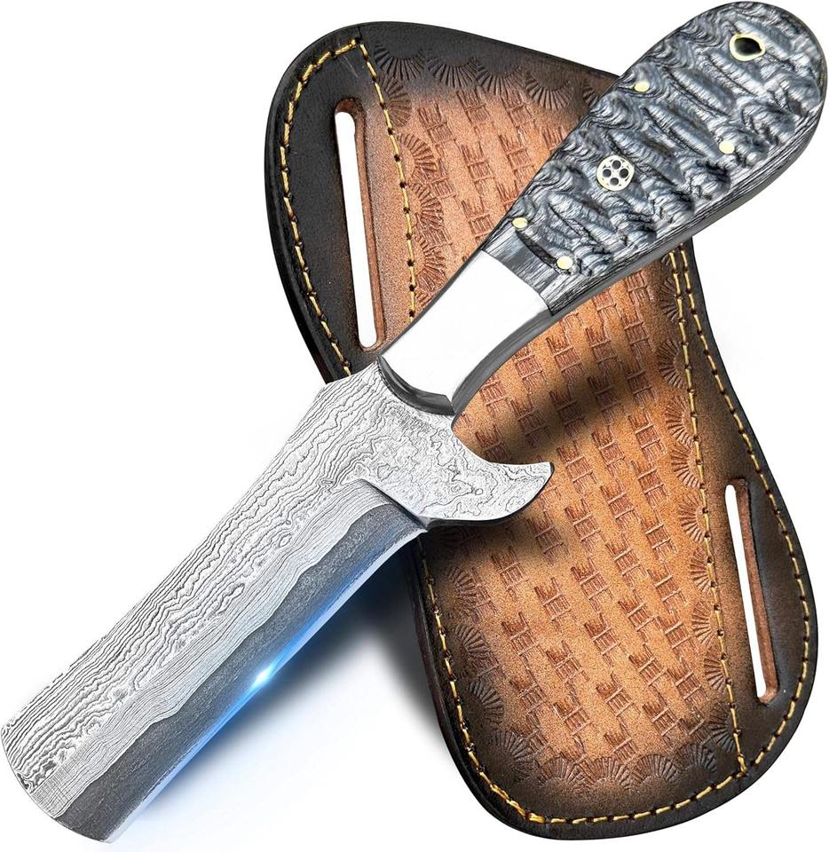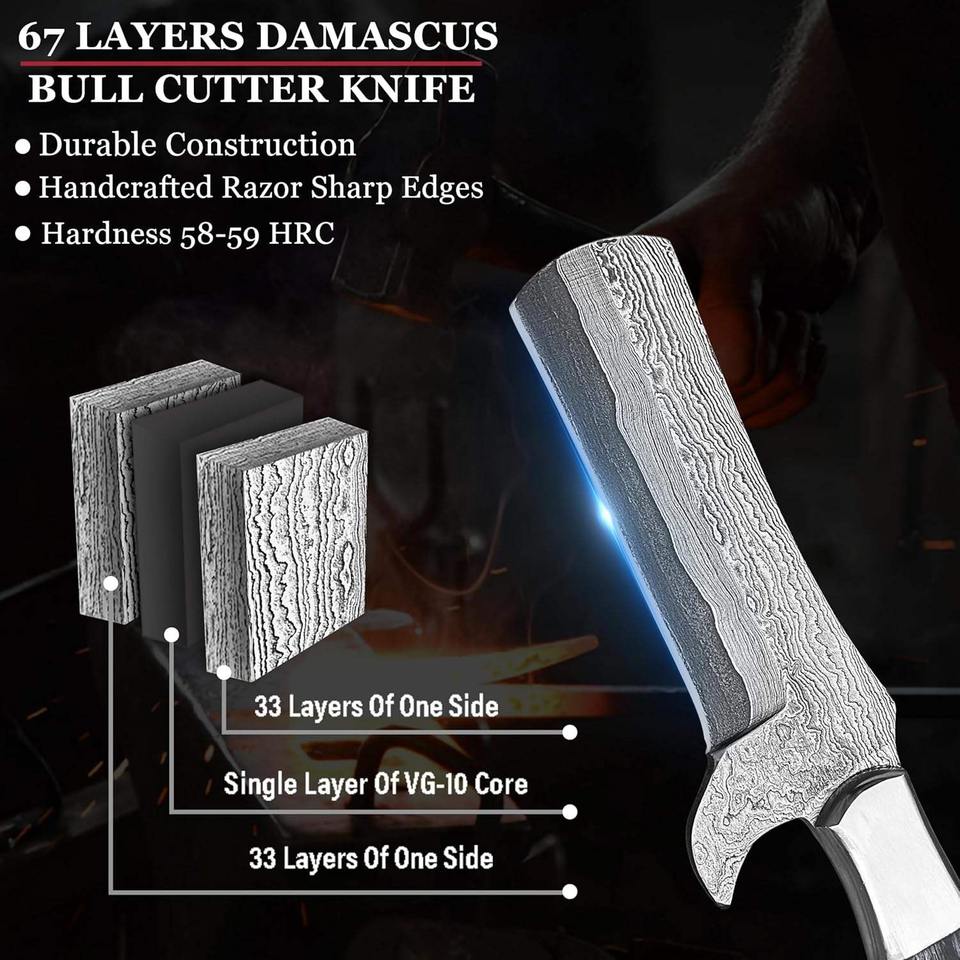 มีดล่าสัตว์ดาบเหล็กดามัสกัสทำมือ ด้ามจับสเตนเลสสตีล ดีไซน์ Bull Cutter พร้อมปลอกหนังสีน้ำตาล สำหรับตั้งแคมป์และเอาตัวรอด