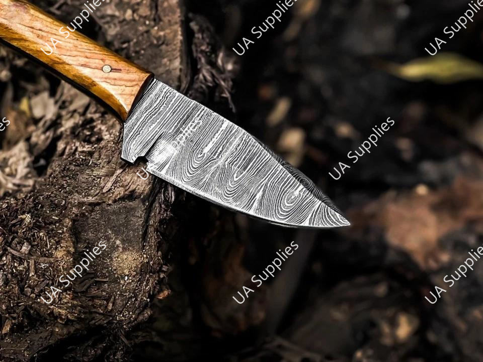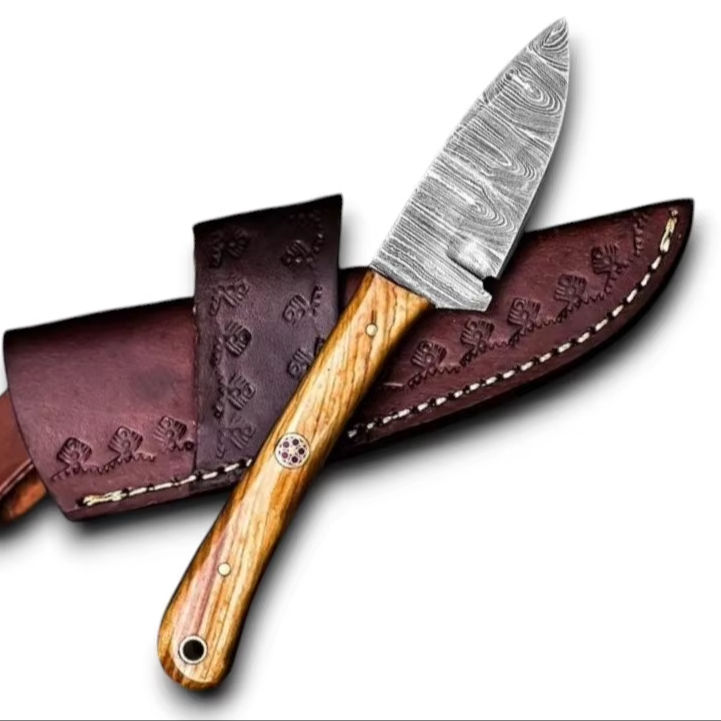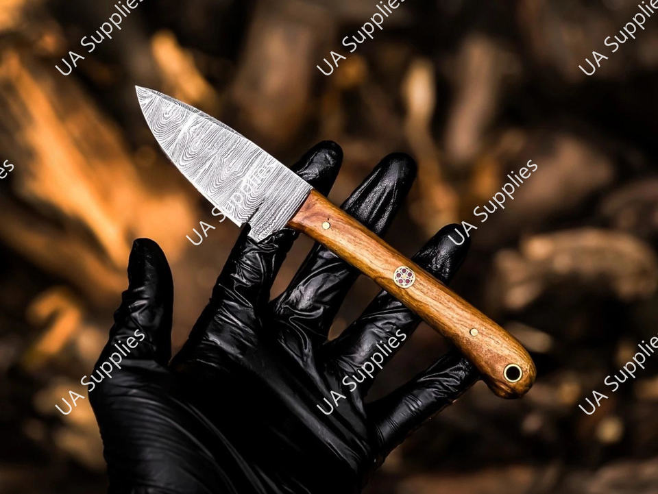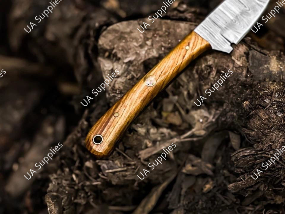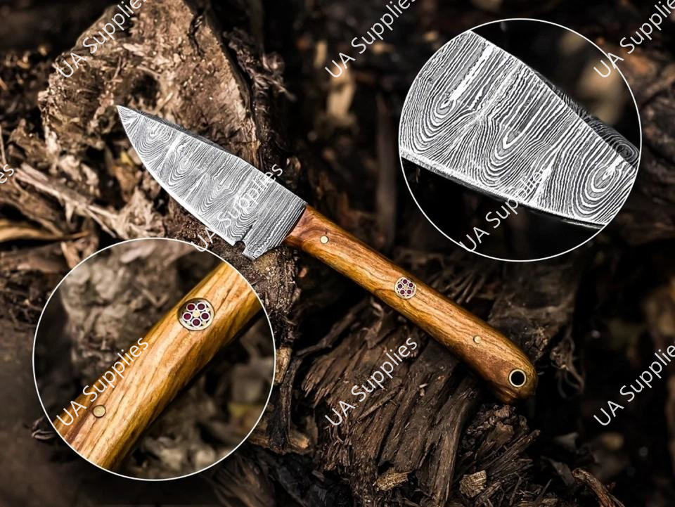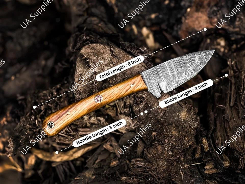 มีดดาบเหล็กดามัสกัสขนาด 3 นิ้ว ใบมีดคมกริบ ปลายแหลม ด้ามจับเต็มด้าม สำหรับพกพา ใช้ในชีวิตประจำวัน เอาตัวรอด ตั้งแคมป์ กิจกรรมกลางแจ้ง พร้อมปลอกหนัง ด้ามไม้ปักก้า รับผลิตแบบ ODM/OEM