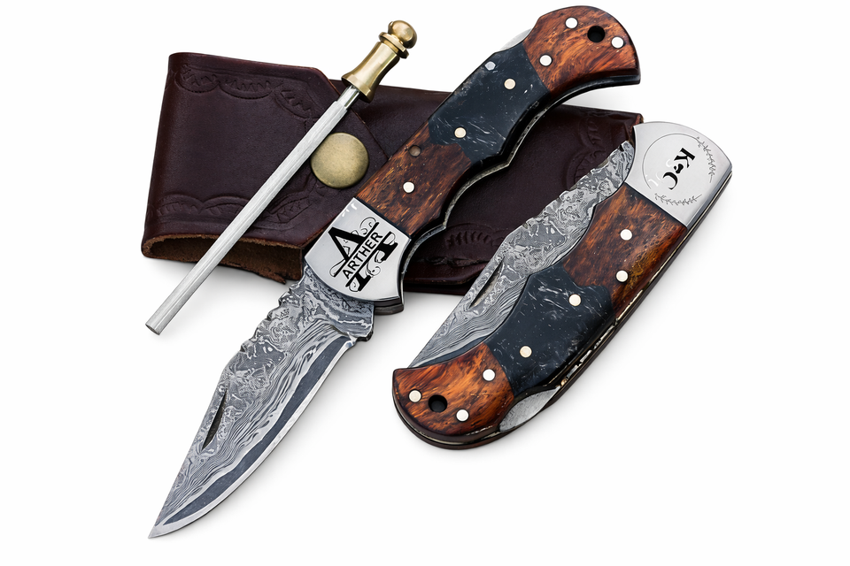 มีดพับอเนกประสงค์แบบเลื่อนเปิด ด้ามจับทำจากไม้และอีพ็อกซี่เรซิ่น พร้อมที่ลับมีด ใบมีดเหล็กดามัสกัส ระบบล็อคด้านหลัง คุณภาพระดับอุตสาหกรรม พร้อมซองหนัง