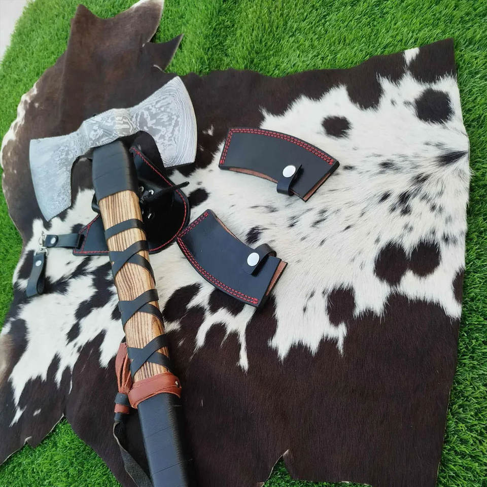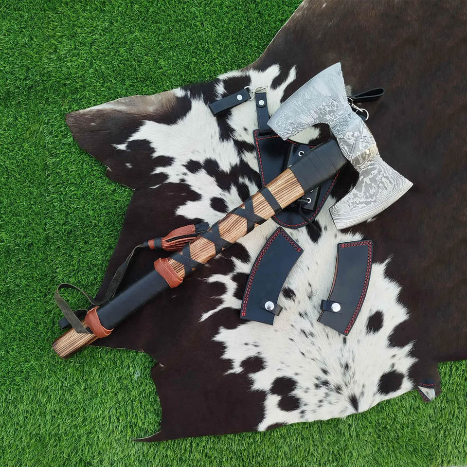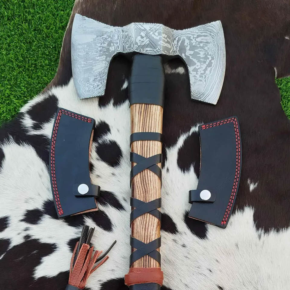 Damascus Steel Double Head Axe Traditional Craft Design Heavy Duty Utility Tool For Camping Bushcraft And Survival Use