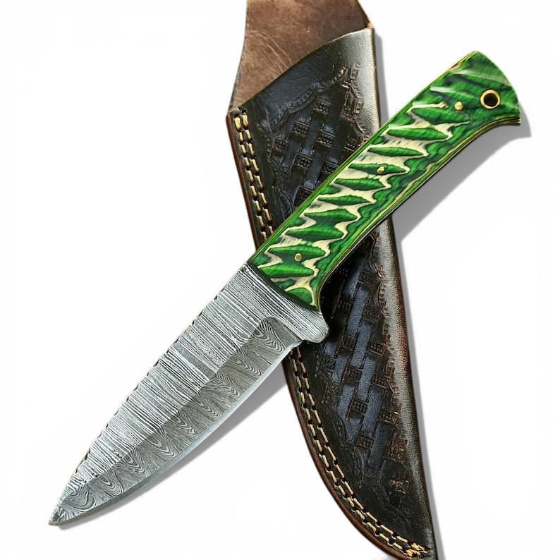 มีดดาบเหล็กดามัสกัส EDC ใบมีดคงที่ สำหรับล่าสัตว์และตั้งแคมป์ ด้ามไม้ปักก้า ปลอกหนัง OEM ปรับแต่งได้ ใช้งานได้หลากหลาย
