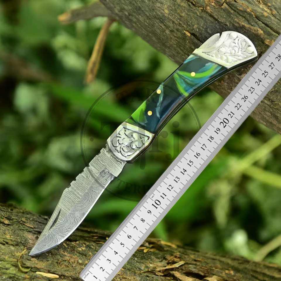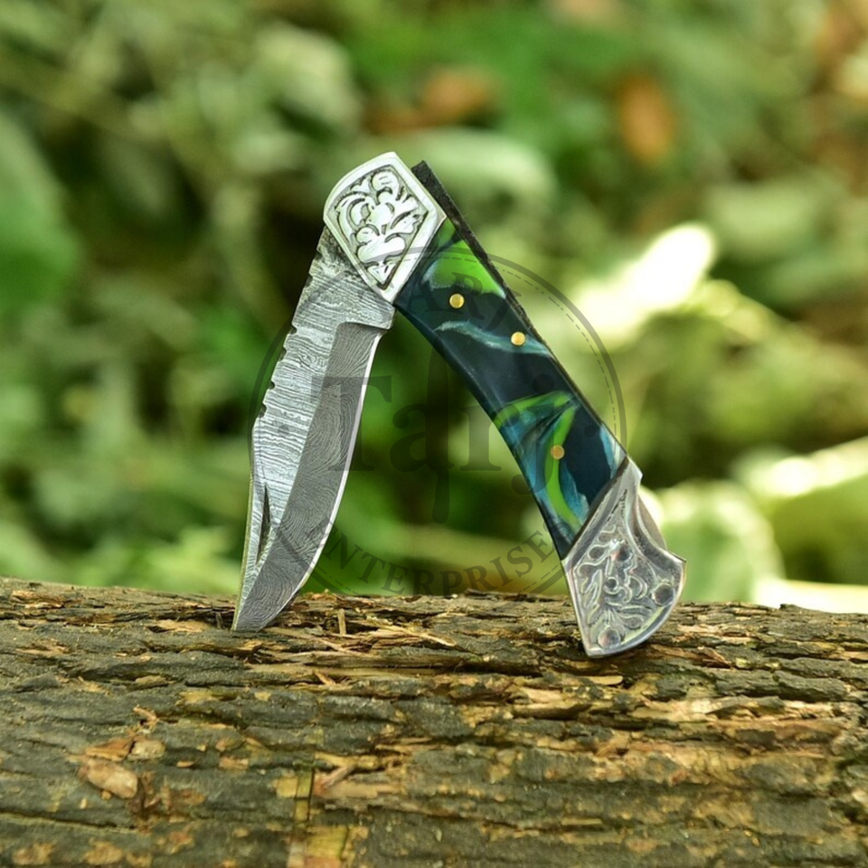มีดพับเหล็กดามัสกัส OEM ความทนทานสูง 58HRC ใบมีดทรงดรอปพอยต์สำหรับกิจกรรมกลางแจ้ง ด้ามเรซิ่น รับประกัน 3 ปี ผู้จัดจำหน่ายขายส่งในสหรัฐอเมริกา