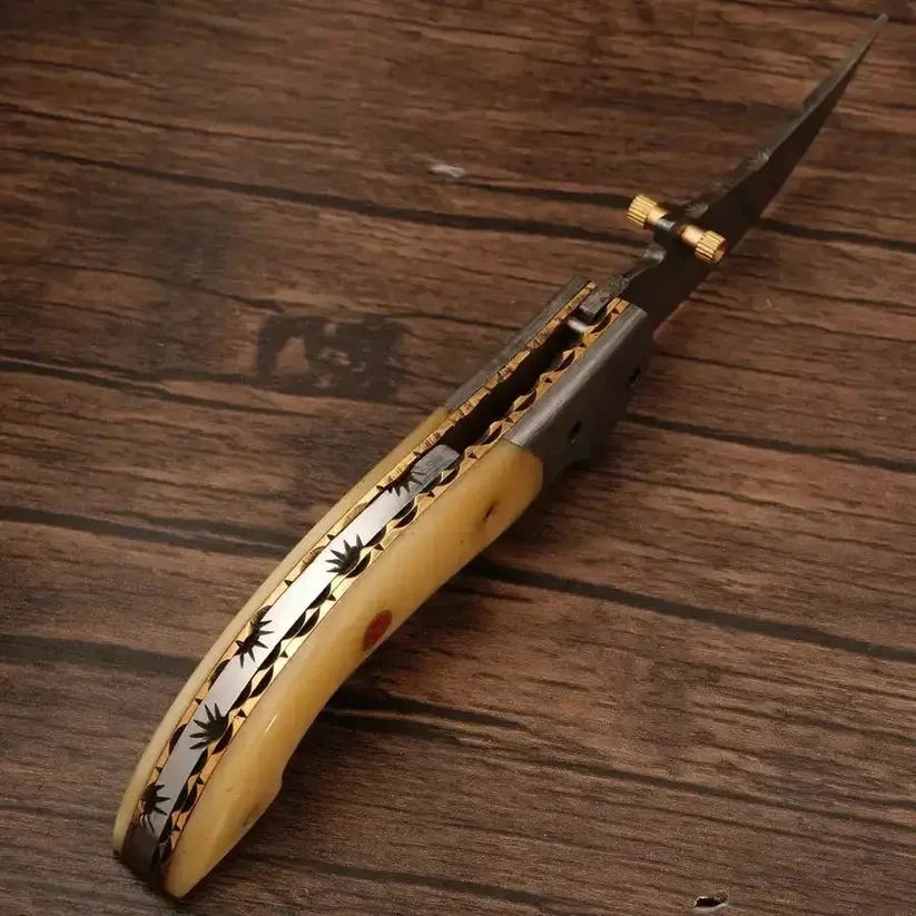 มีดพับเหล็กดามัสกัสสำหรับล่าสัตว์และตั้งแคมป์ ใบมีดตรง ปลายคลิป ด้ามจับทำจากกระดูก คุณภาพอุตสาหกรรม 58HRC Pasha High