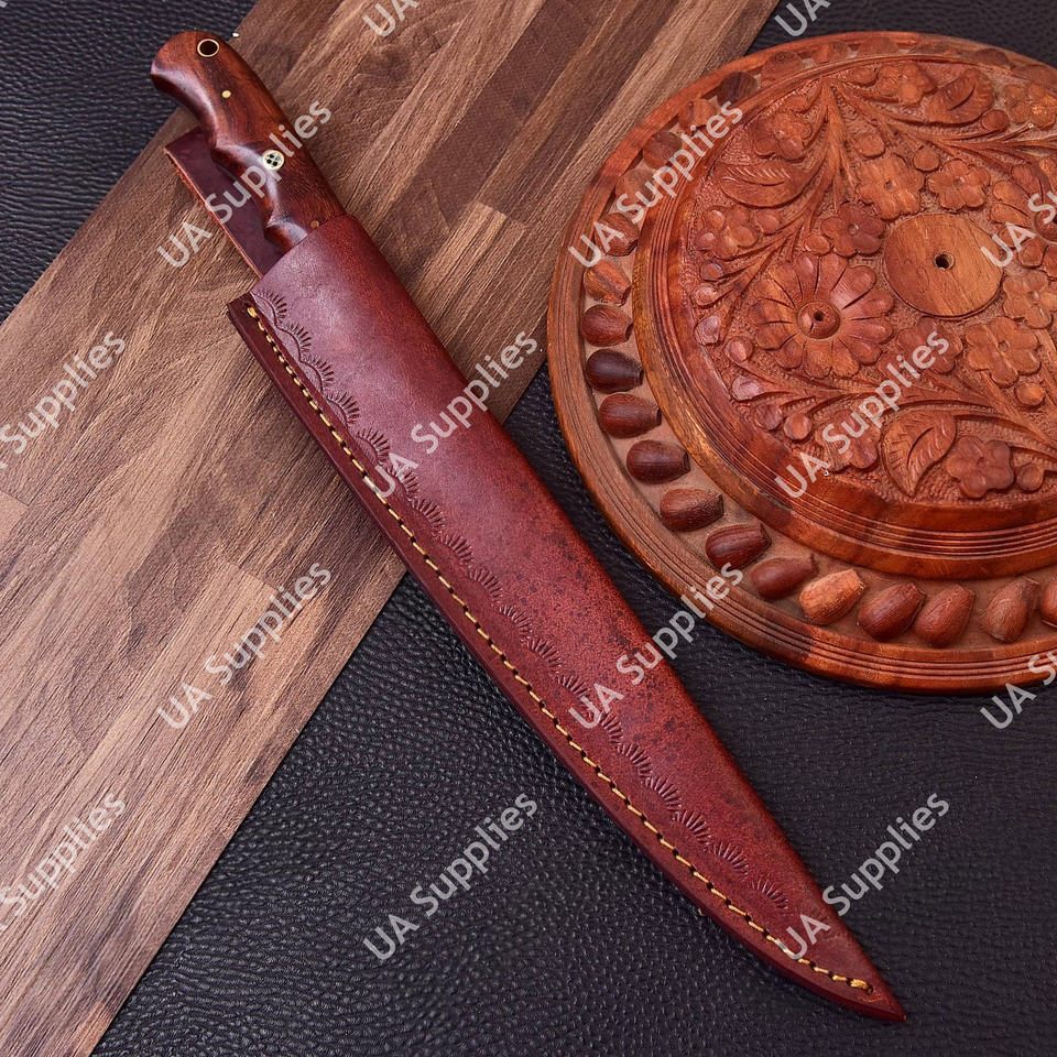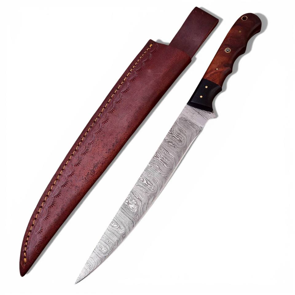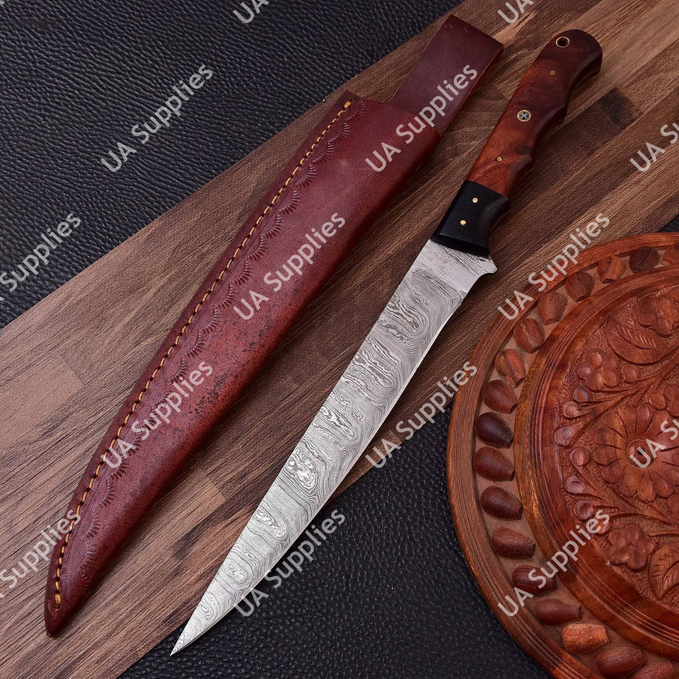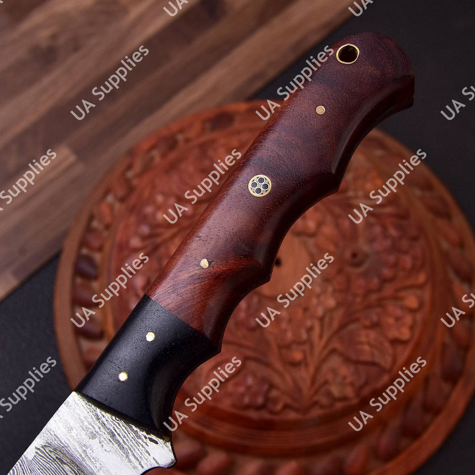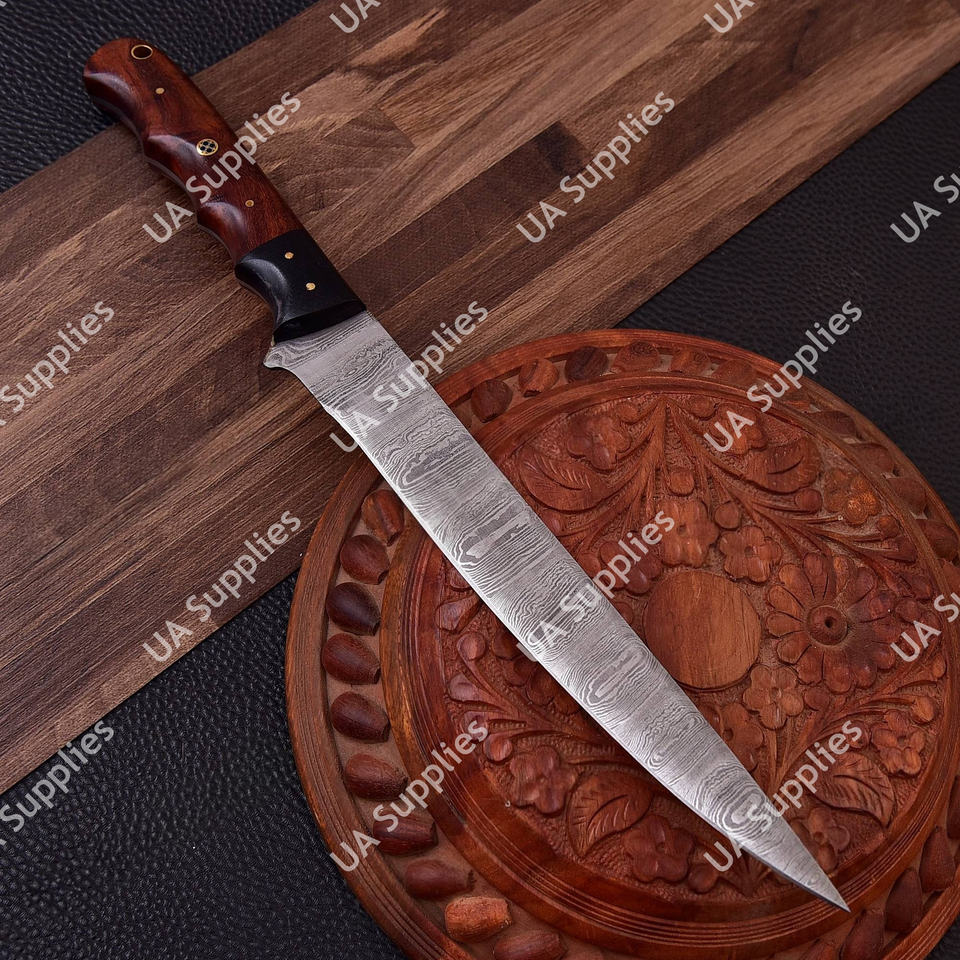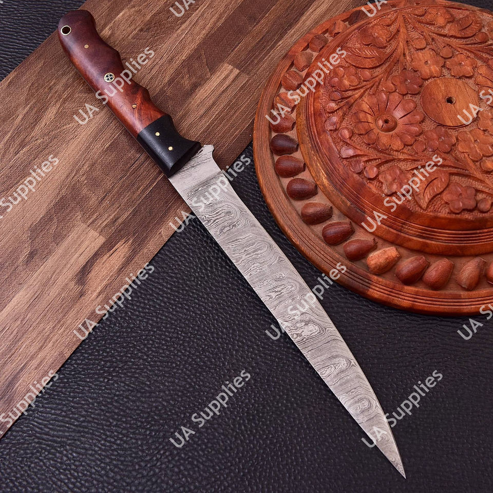 มีดแล่เนื้อเหล็กดามัสกัสแบบฟูลแทง น้ำหนักเบา ขนาด 7 นิ้ว ด้ามไม้พะยูงธรรมชาติ ผิวขัดเงา คุณภาพระดับอุตสาหกรรม ผลิตด้วยมือ