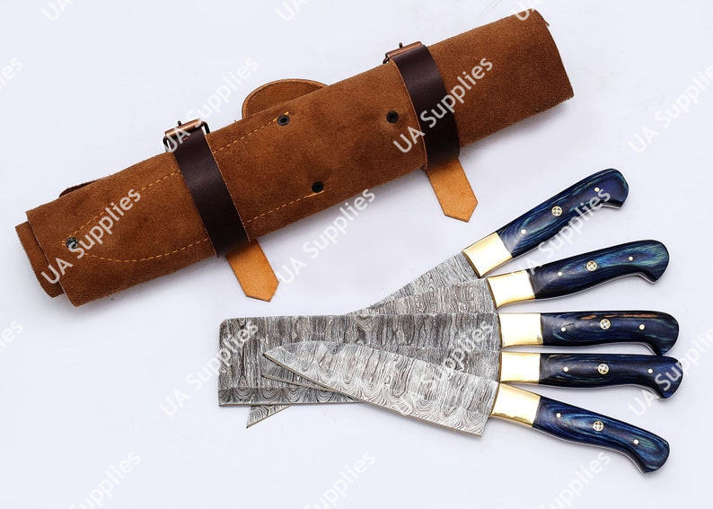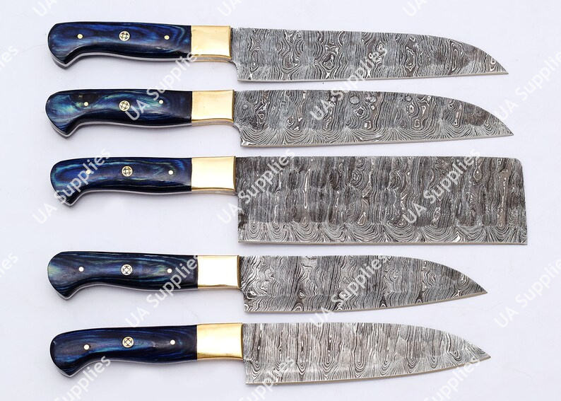 เหล็กดามัสกัส OEM/ODM ใบมีดตีขึ้นรูปคมกริบ 58 HRC ชุดมีดทำครัวระดับมืออาชีพ ด้ามไม้ปักก้า ทองเหลือง