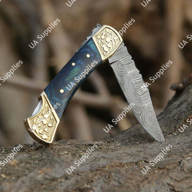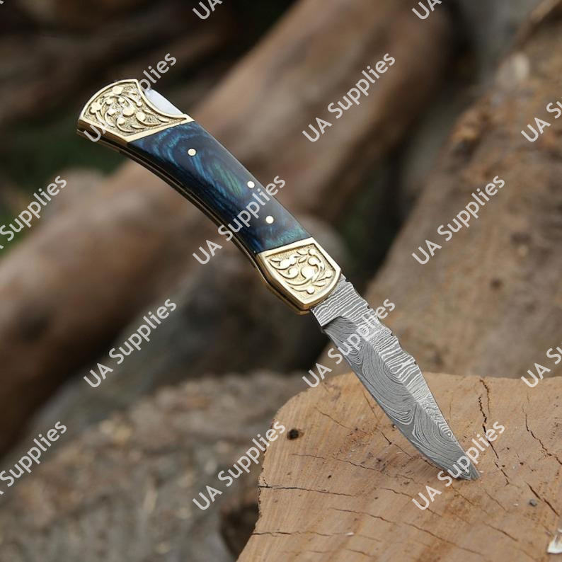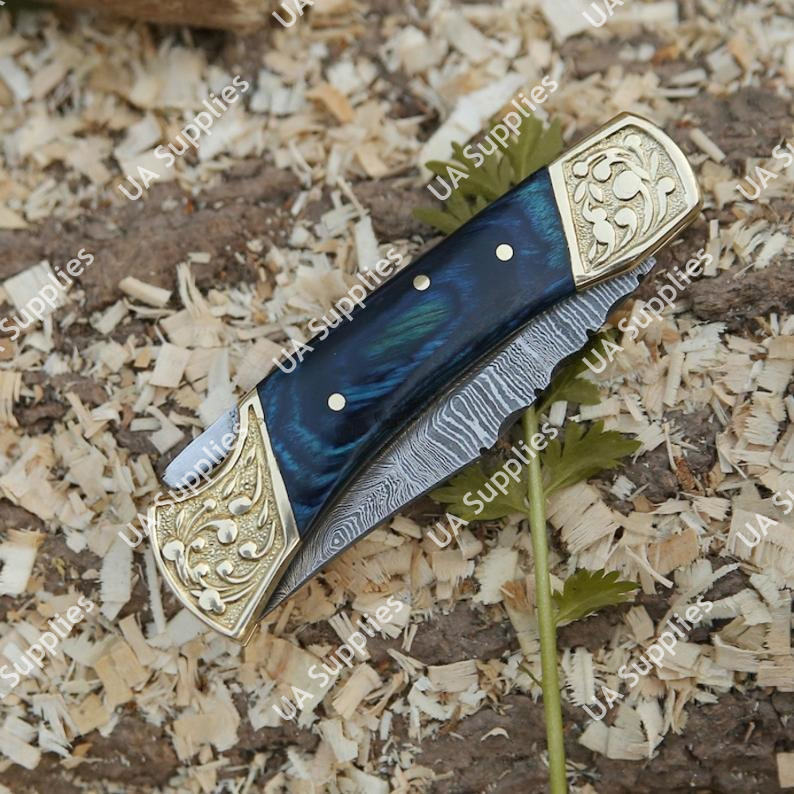 มีดพับเหล็กดามัสกัสระดับมืออาชีพ ด้ามไม้ปักก้าสลักลายทองเหลือง ปลายมีดแบบดรอปพอยต์ รับผลิตแบบ OEM/ODM สำหรับพกพาใช้งานทุกวัน