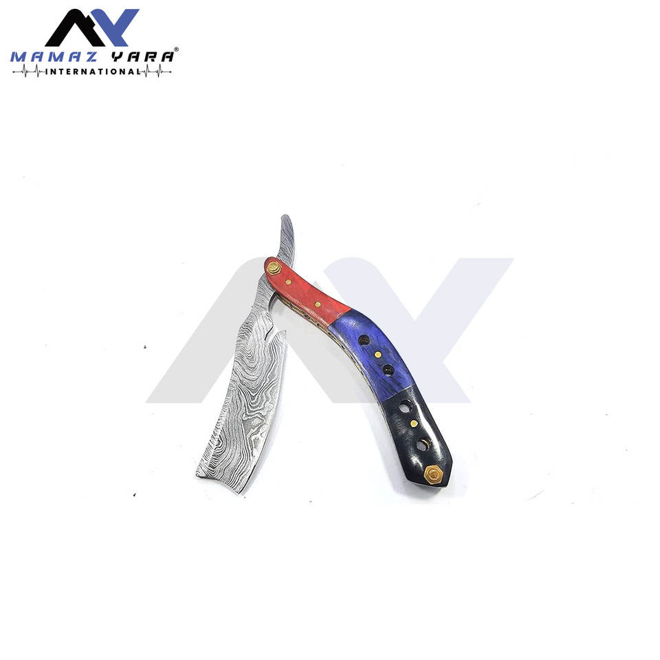 มีดโกนหนวดเหล็กดามัสกัส ใบมีดตรง ด้ามไม้สีธรรมชาติ ทำจากเขาควาย งานแฮนด์เมด พร้อมปลอกหนังและเข็มขัด