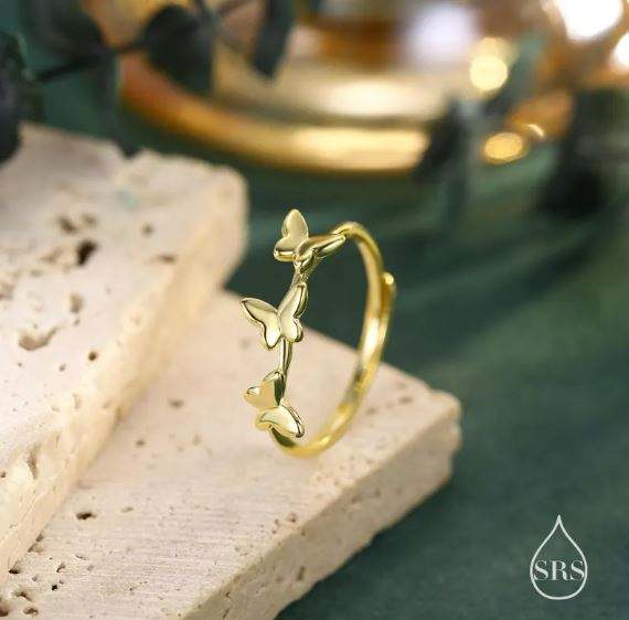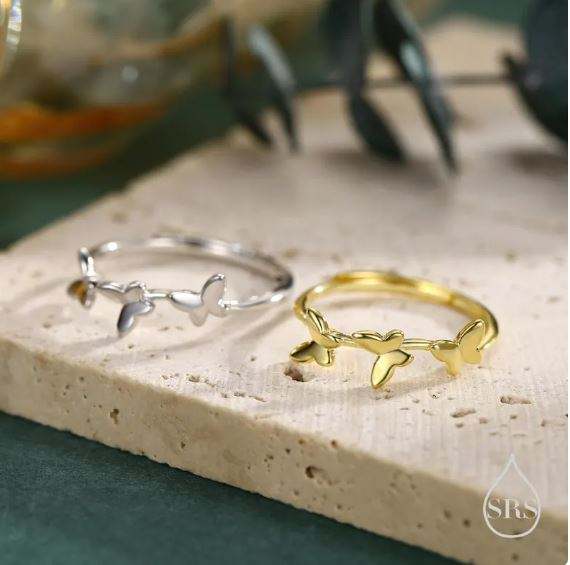 แหวนผีเสื้อเต้นรำทำจากเงินสเตอร์ลิง ปรับขนาดได้ แหวนผีเสื้อเรียบหรู แหวนที่ได้แรงบันดาลใจจากธรรมชาติ