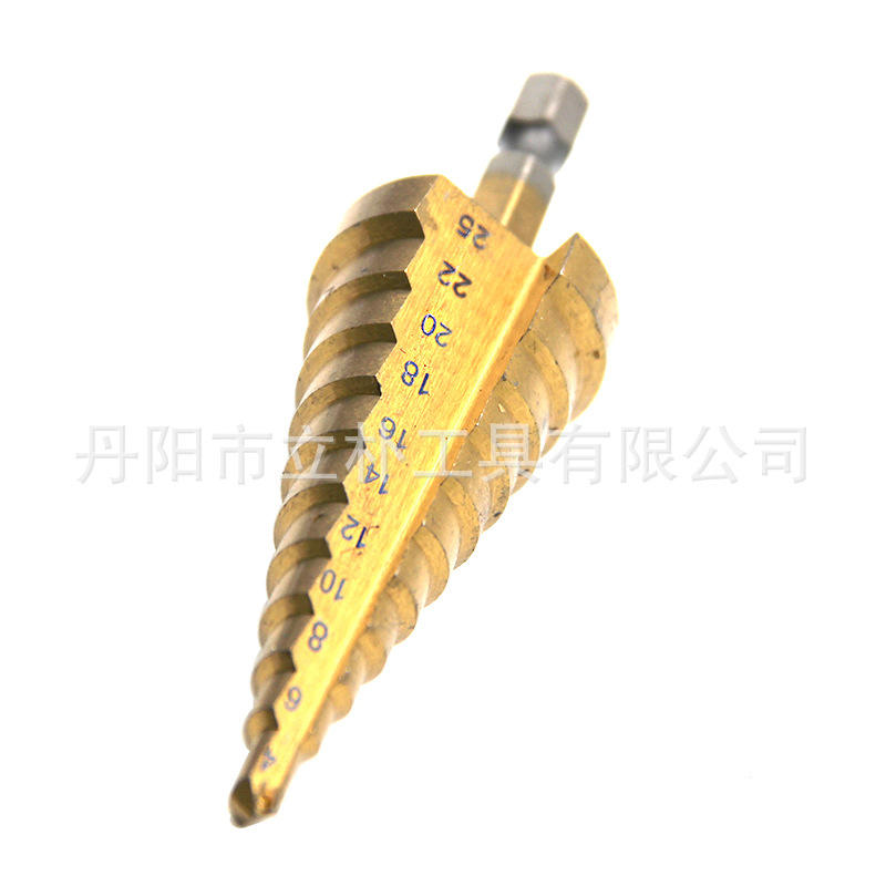 ดอกสว่านเจาะรูแบบขั้นบันได ยี่ห้อตัวปู ทูลส์ เมืองตันหยาง ขนาด 4-25 มม. แบบเมตริก ก้านหกเหลี่ยม ฟลูตตรง เคลือบไทเทเนียม 11 ขั้น