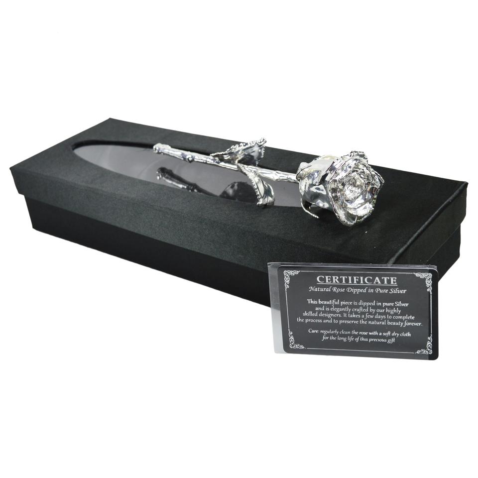ขาตั้งสีดำเข้มพร้อมกุหลาบแท้เคลือบเงิน ดีไซน์หรูหรา บรรจุในกล่องสุดหรู เหมาะสำหรับเป็นของขวัญ