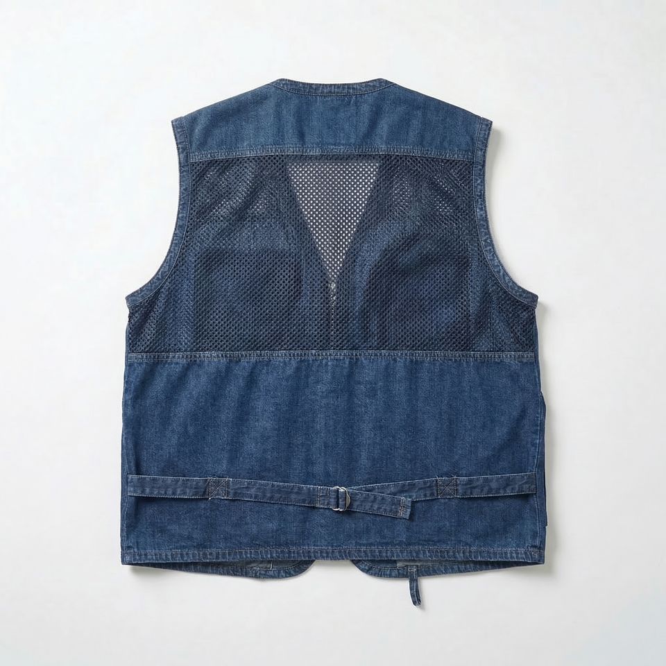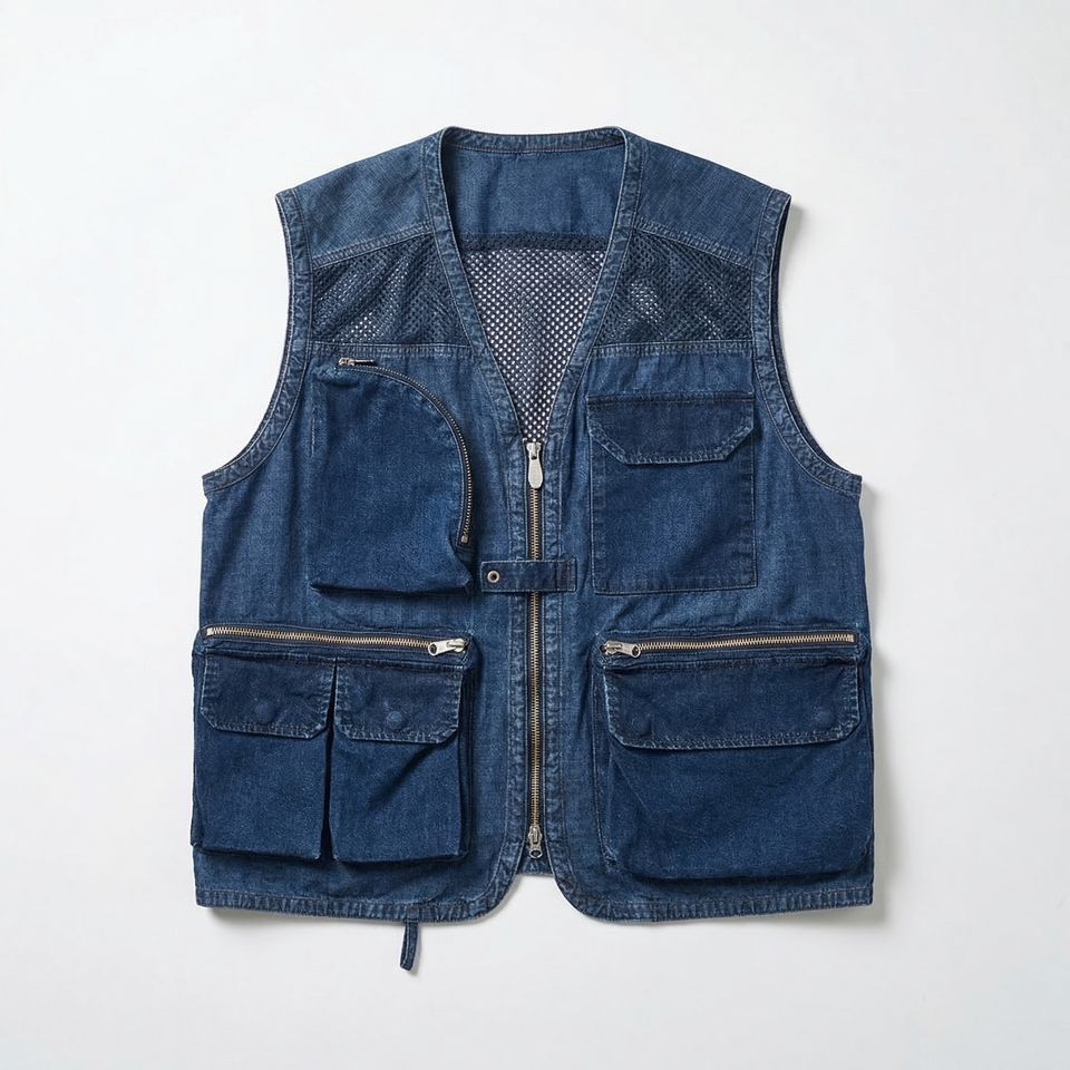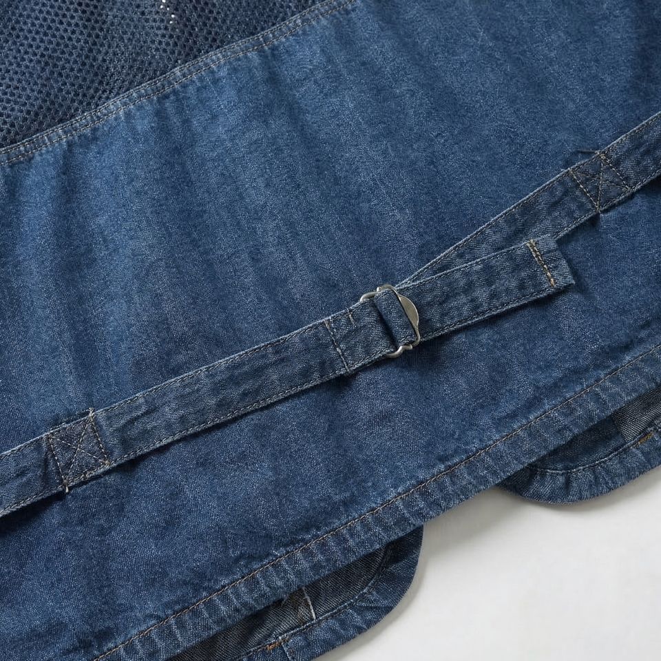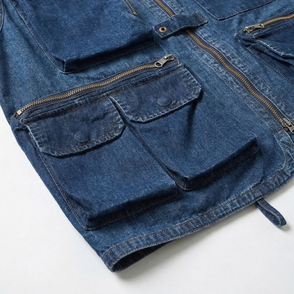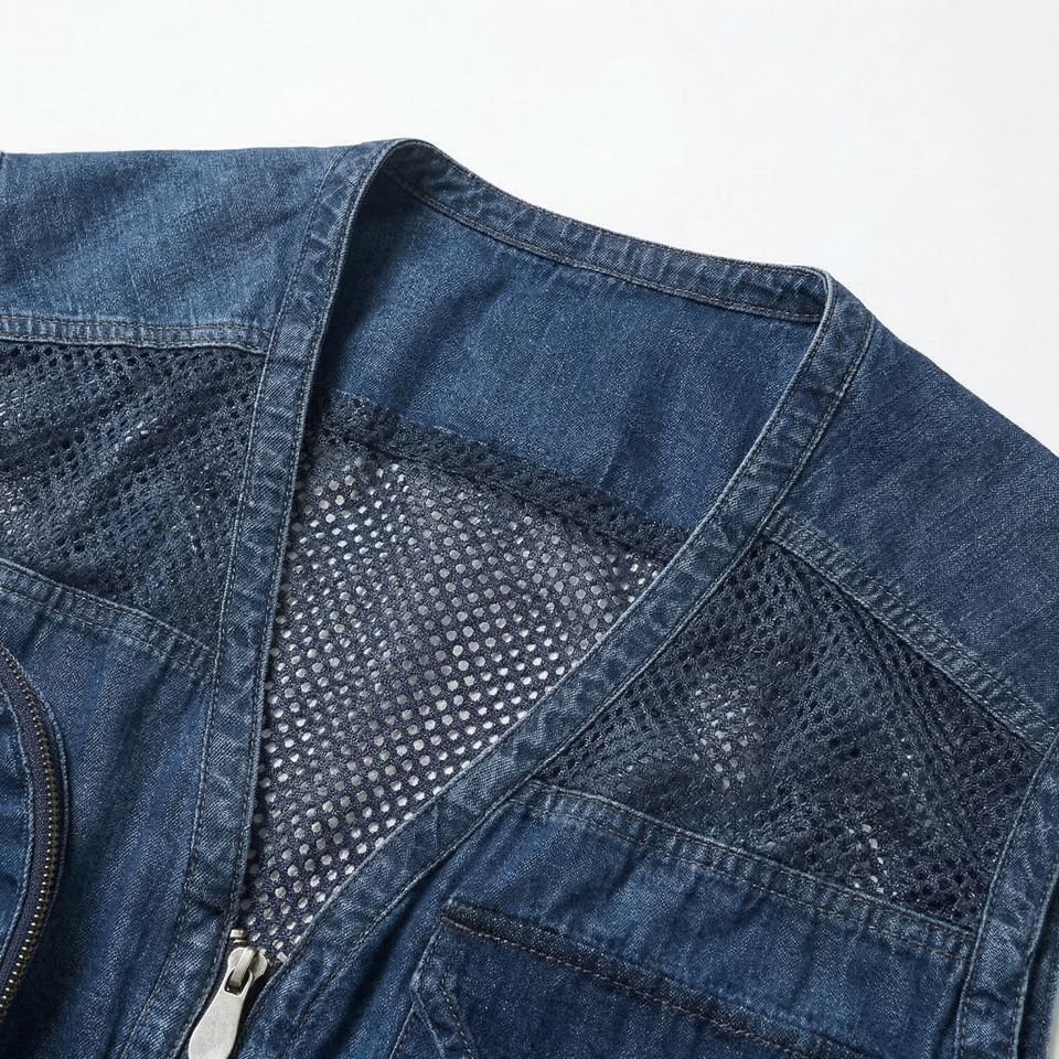 เสื้อกั๊กยีนส์สีน้ำเงินเข้มแบบตาข่าย | เสื้อกั๊กยุทธวิธีแบบมีซิปหลายช่อง | เสื้อแจ็คเก็ตทำงานแบบไม่มีแขนระบายอากาศได้ดี | ผู้ผลิต OEM ตามสั่ง