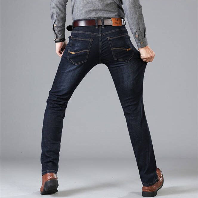 กางเกงยีนส์ผ้าฝ้ายปกติสีน้ําเงินเข้มกางเกงผู้ชายStreetwearยืดกางเกงJeanกางเกงยีนส์ลําลองผู้ชายตรงSlimสีทึบย้อม