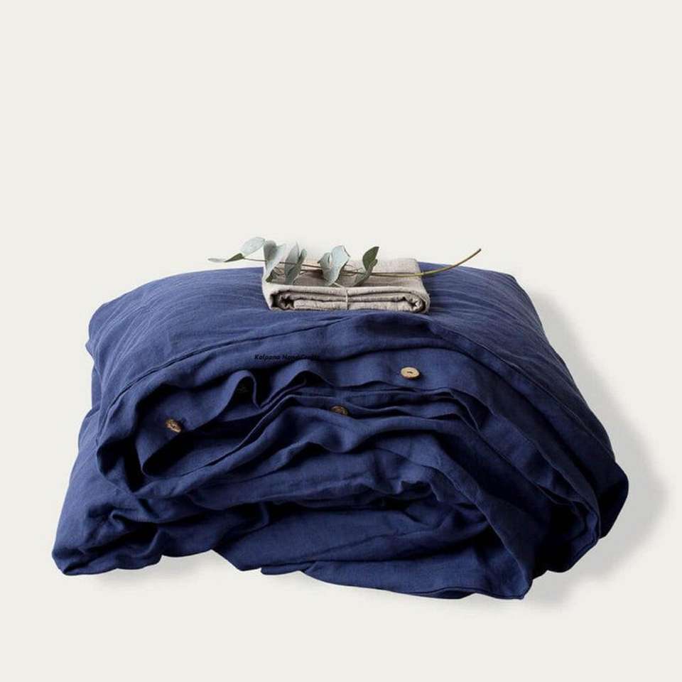 ชุดเครื่องนอนผ้าลินินสีน้ำเงินเข้ม พร้อมปลอกผ้านวมและปลอกหมอนสองใบ ผ้าผ่านการซักแล้ว สำหรับตกแต่งบ้าน ห้องนอน โรงแรม ชุด 3 ชิ้น