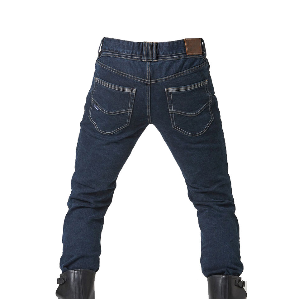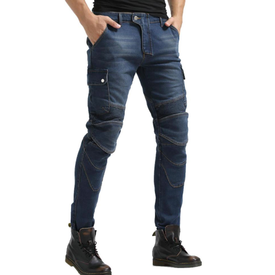 กางเกงยีนส์ขี่มอเตอร์ไซค์สีน้ำเงินเข้ม ไซส์พลัส ทรงเข้ารูป ผลิตจากผ้าฝ้าย 100% บุซับในอย่างดีเพื่อความทนทาน พร้อมแผ่นกันกระแทก CE ที่ถอดออกได้