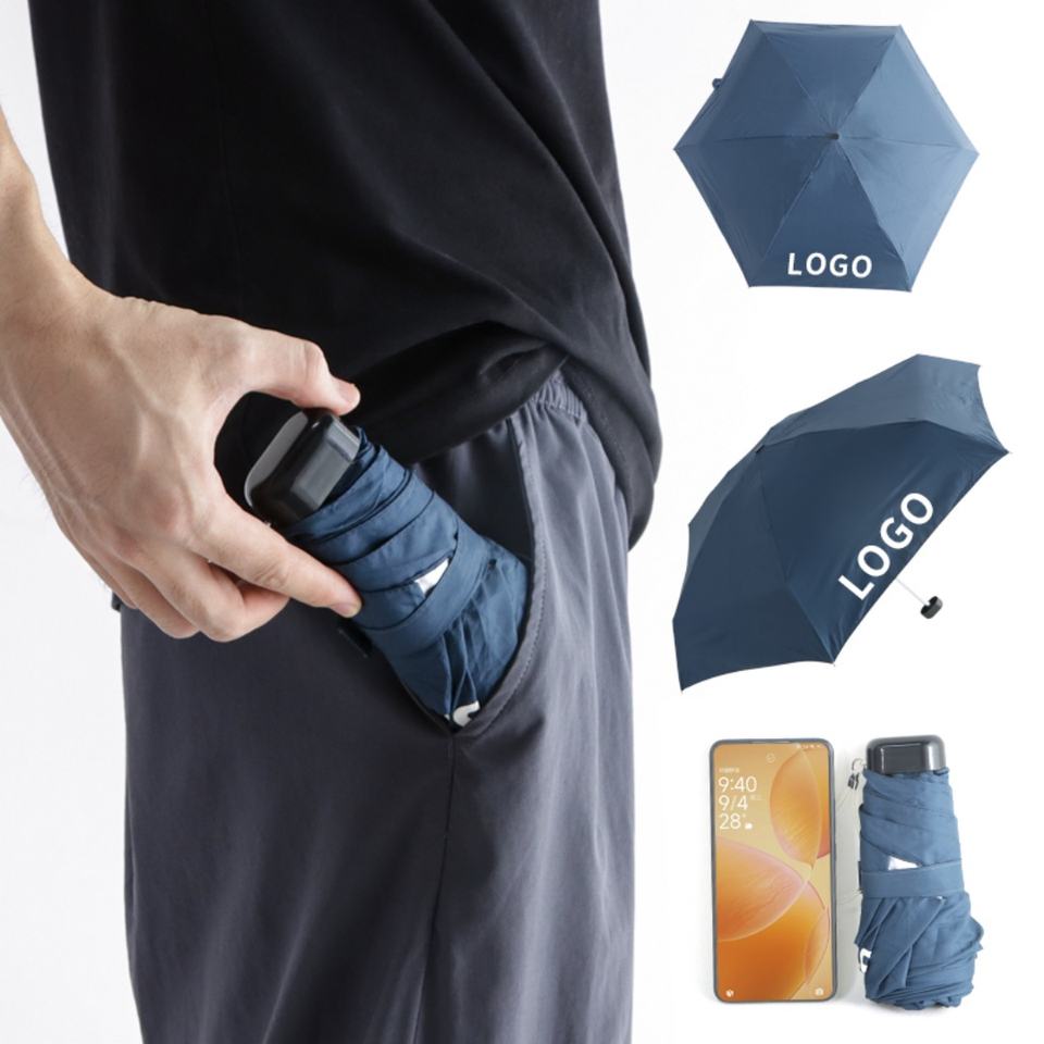 ร่มพกพาขนาดเล็กพับได้ 5 ตอน สีน้ำเงินเข้ม ป้องกันรังสียูวี พร้อมพิมพ์โลโก้ตามสั่ง สำหรับกันฝน