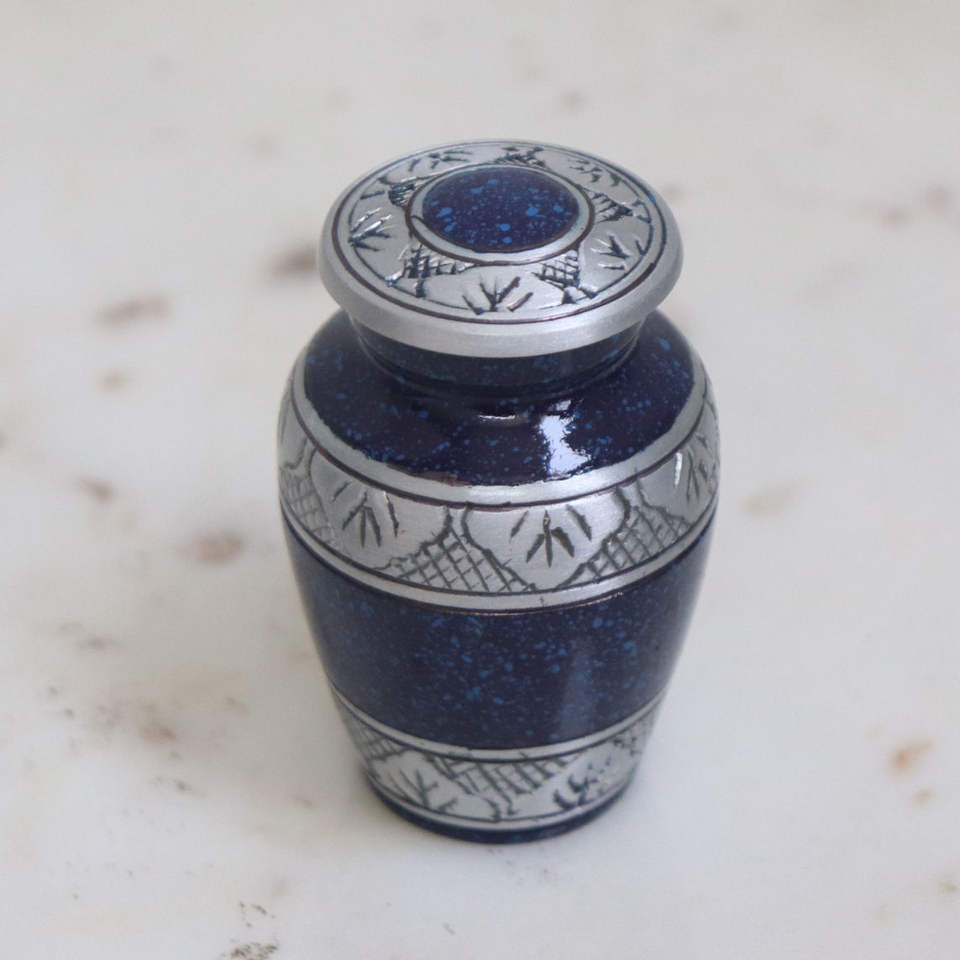 โกศโลหะสีน้ำเงินเข้มลายจุด พร้อมฝาปิดลายไม้ไผ่สีเงินสลักด้วยมือ สำหรับเก็บอัฐิในพิธีฌาปนกิจ
