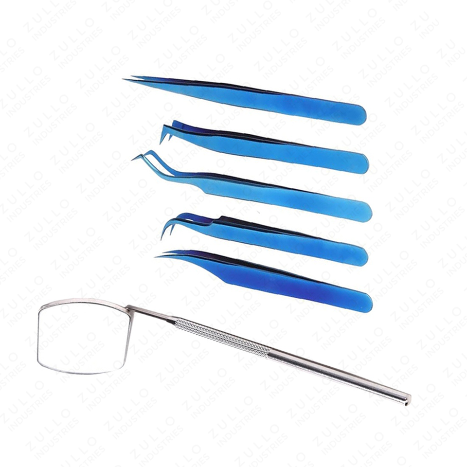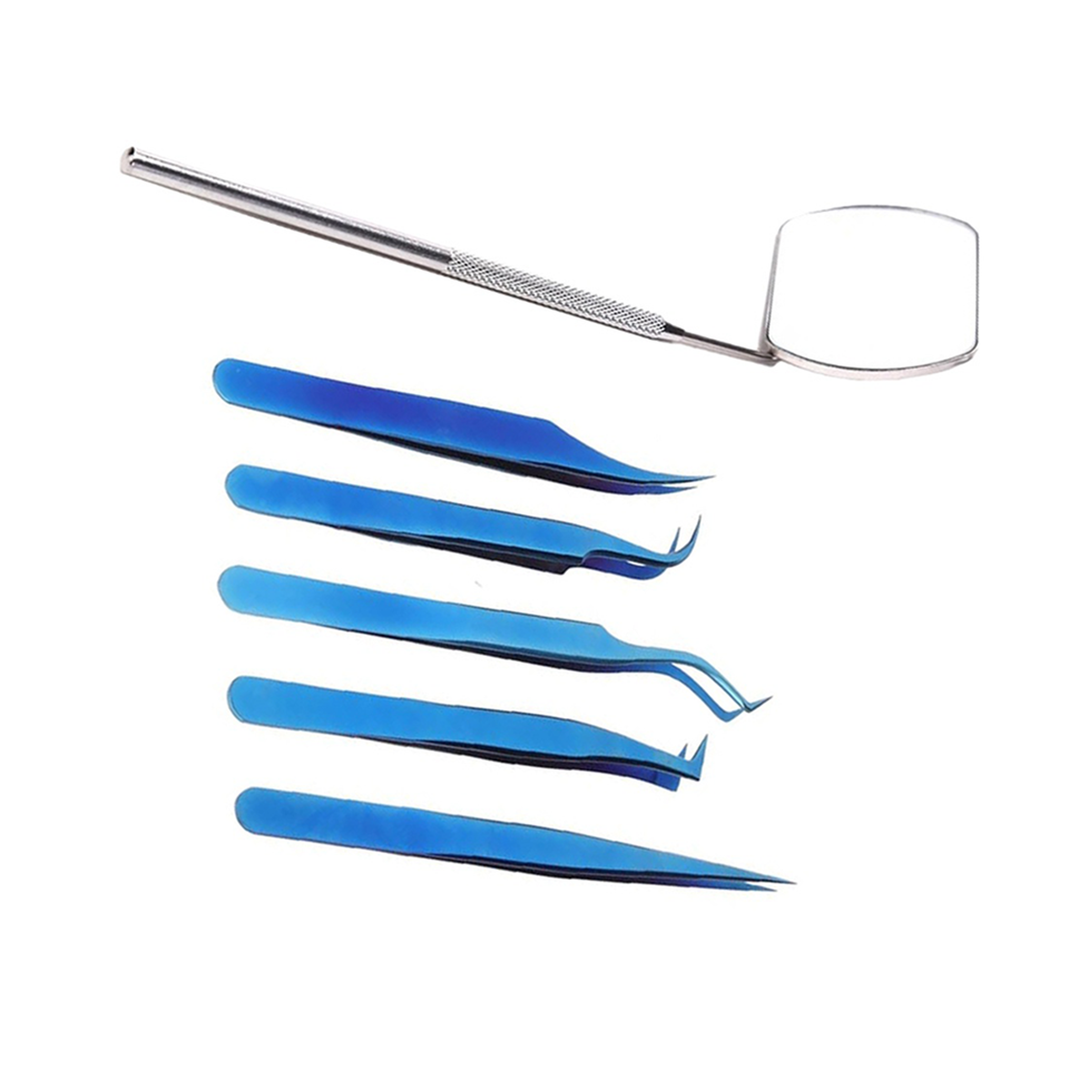 ชุดแหนบต่อขนตาสแตนเลสสีน้ำเงินเข้ม ปลายแหลมแม่นยำ พร้อมกระจกเงา ขายส่ง
