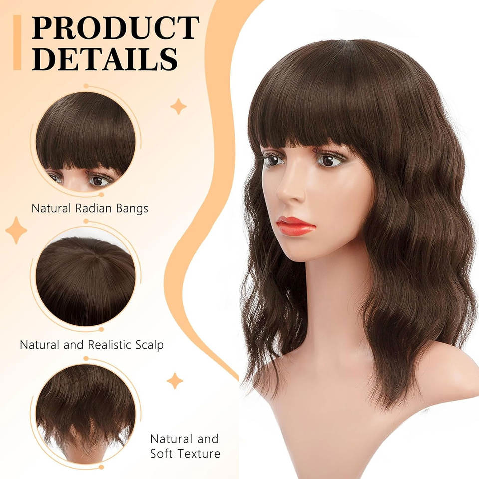 วิกผมบลอนด์หยักสั้น14นิ้วสีน้ำตาลเข้มมีผมม้าสังเคราะห์ดูเป็นธรรมชาติเส้นใยทนความร้อน