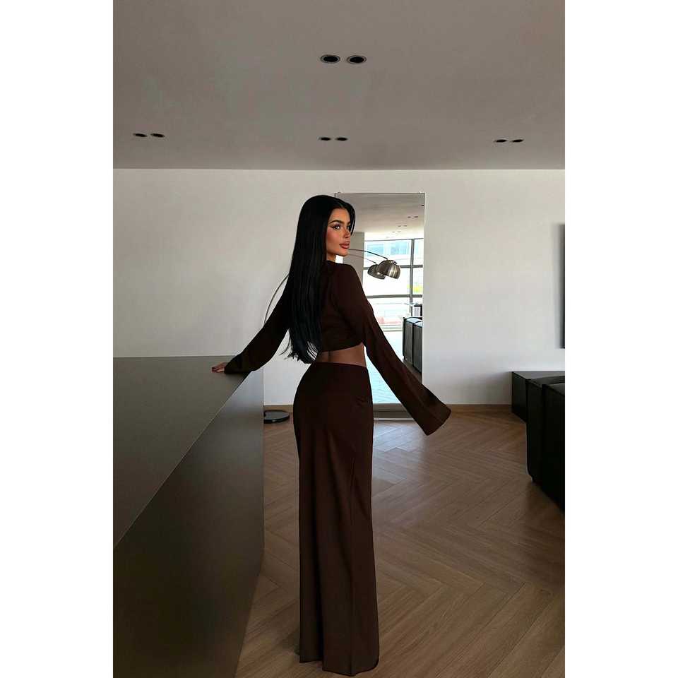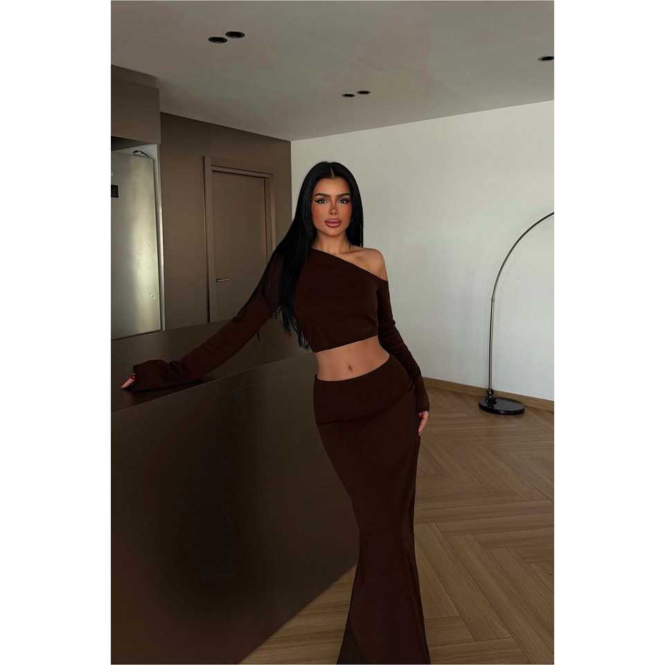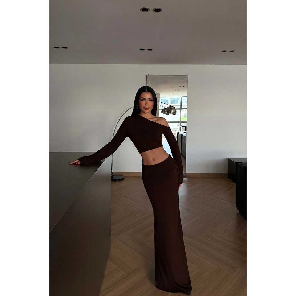 ชุดเซ็ตเสื้อกับกางเกงขาสั้นสีน้ำตาลเข้ม 2 ชิ้น ไซส์ XS สไตล์ลำลองสำหรับฤดูร้อน เหมาะสำหรับใส่ไปทำงานหรือใส่ลำลอง
