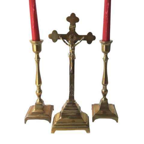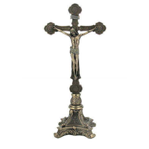 แท่นบูชาทองเหลืองสีน้ำตาลเข้มพร้อมไม้กางเขนขัดเงา อุปกรณ์ทางศาสนาสำหรับโบสถ์ ไม้กางเขนแบบคริสเตียนคาทอลิกสั่งทำได้