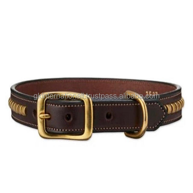 ปลอกคอสุนัขสายบังเหียนหนังสีน้ำตาลเข้ม,เย็บติดแน่นด้วยตัวยึดตกแต่งและหัวเข็มขัดหมุดทองเหลืองและแหวนรูปตัว D