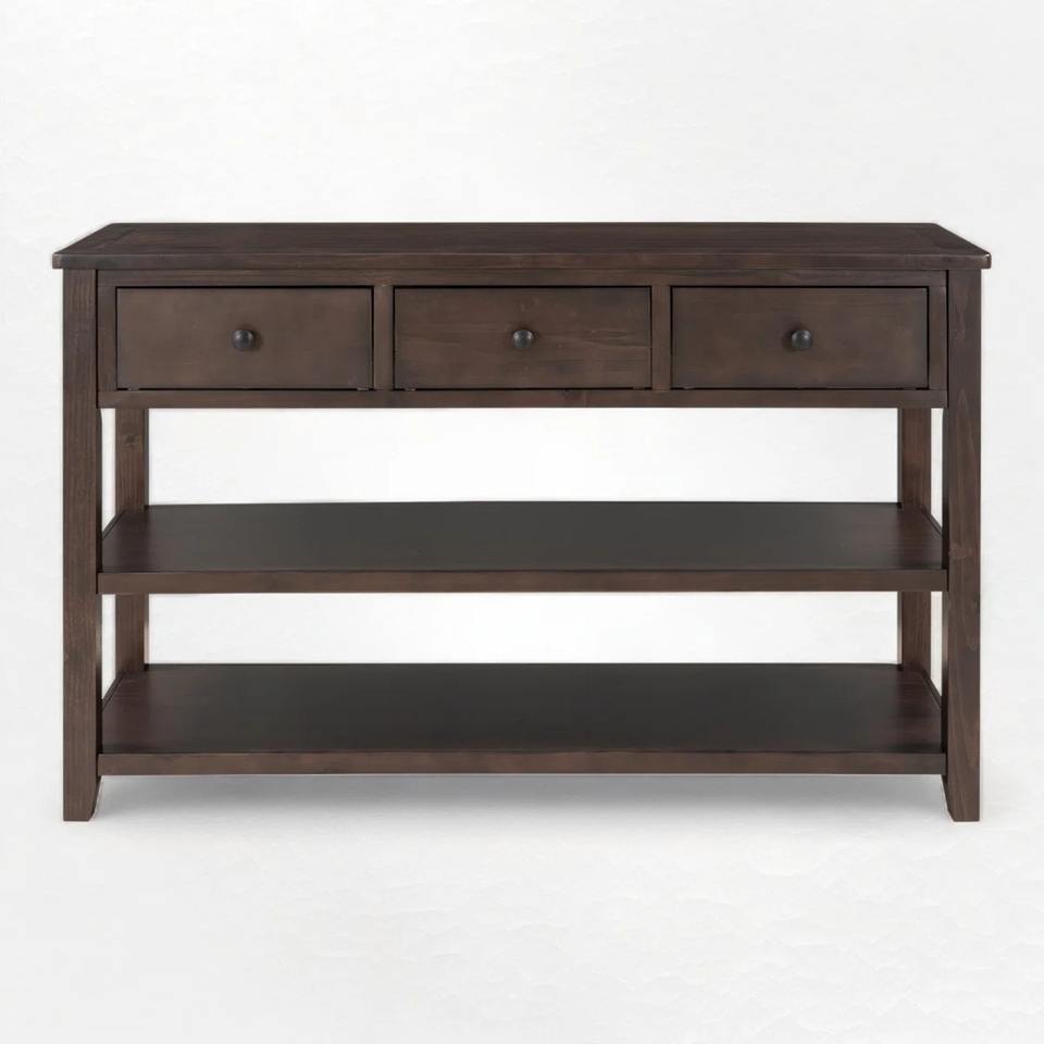 โต๊ะคอนโซลเหล็กสีน้ำตาลเข้มสไตล์โมเดิร์น 3 ลิ้นชัก 2 ชั้นวางของแบบเปิด ตู้เก็บของสำหรับห้องนั่งเล่นและทางเข้าบ้าน