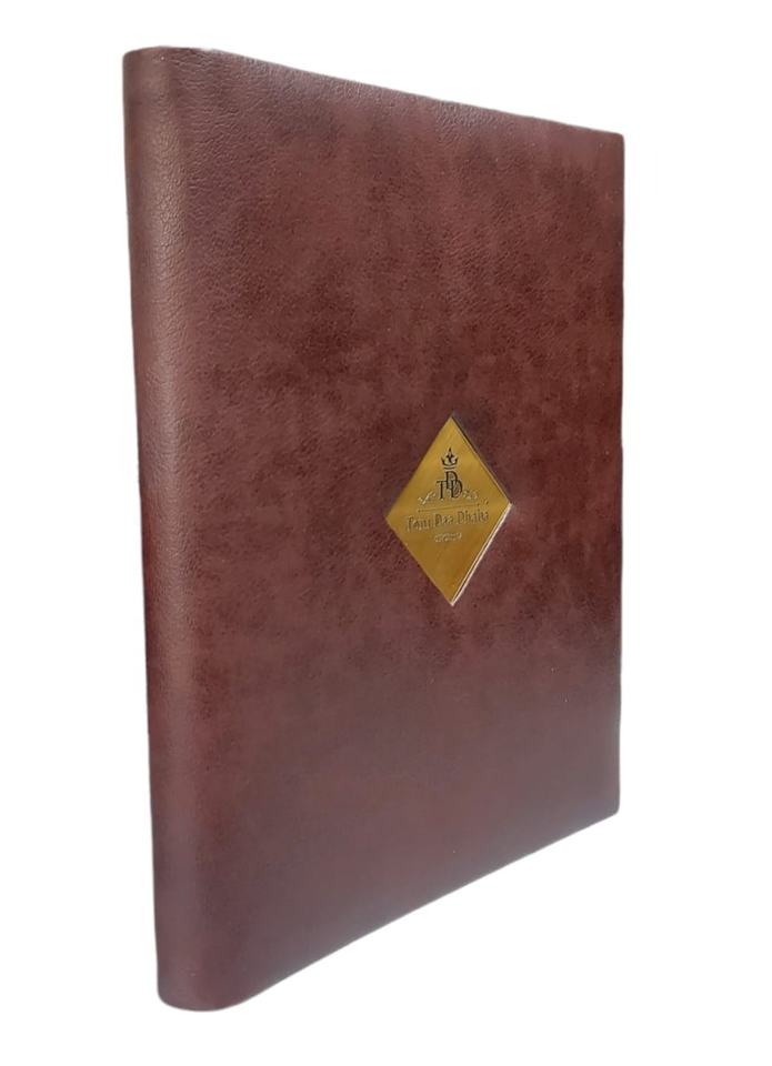ฝาปิดเมนูร้านอาหารทำจากไม้สีน้ำตาลเข้มแผ่นอะคริลิคสลักด้วยเลเซอร์โลโก้สีทอง