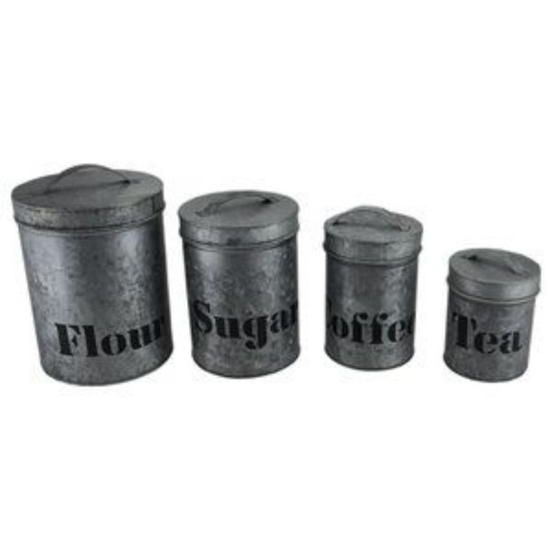 กระป๋องเก็บอาหารโลหะชุบสังกะสีสีดำพร้อมฝาปิดทรงกลมสำหรับใส่น้ำตาล ชา และกาแฟในครัว ชุดสี่ใบ