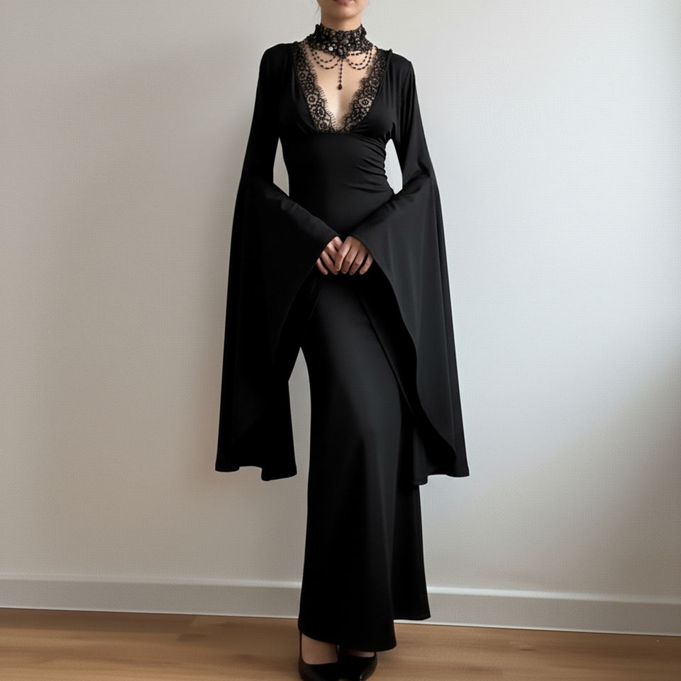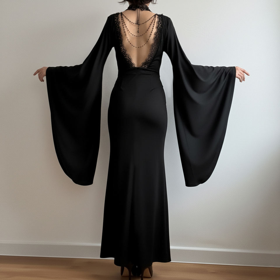 เดรสยาวทรงเมอร์เมด คอวี แขนทรงปีกค้างคาว แต่งลูกปัด ดีไซน์โกธิคสีเข้ม สวยสง่าสำหรับผู้หญิง