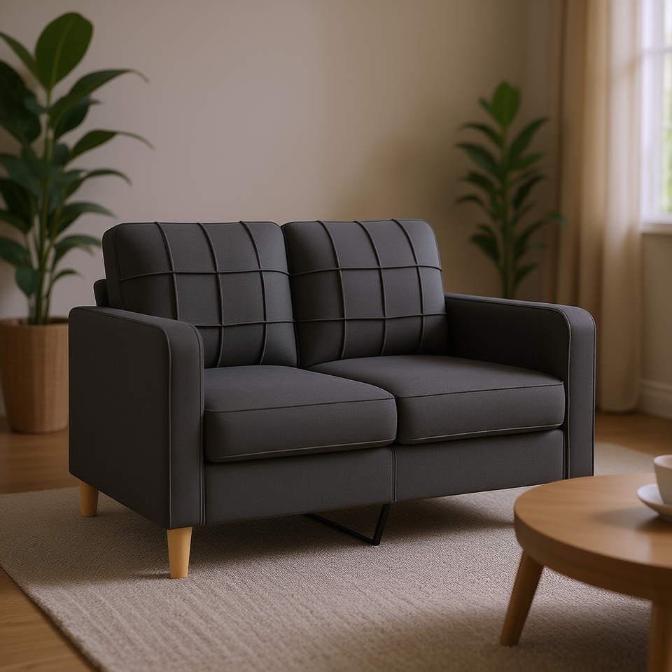 โซฟาผ้าสีเทาเข้ม 2 ที่นั่ง พนักพิงแบบ Tufted เฟอร์นิเจอร์ห้องนั่งเล่นทันสมัย ขาไม้