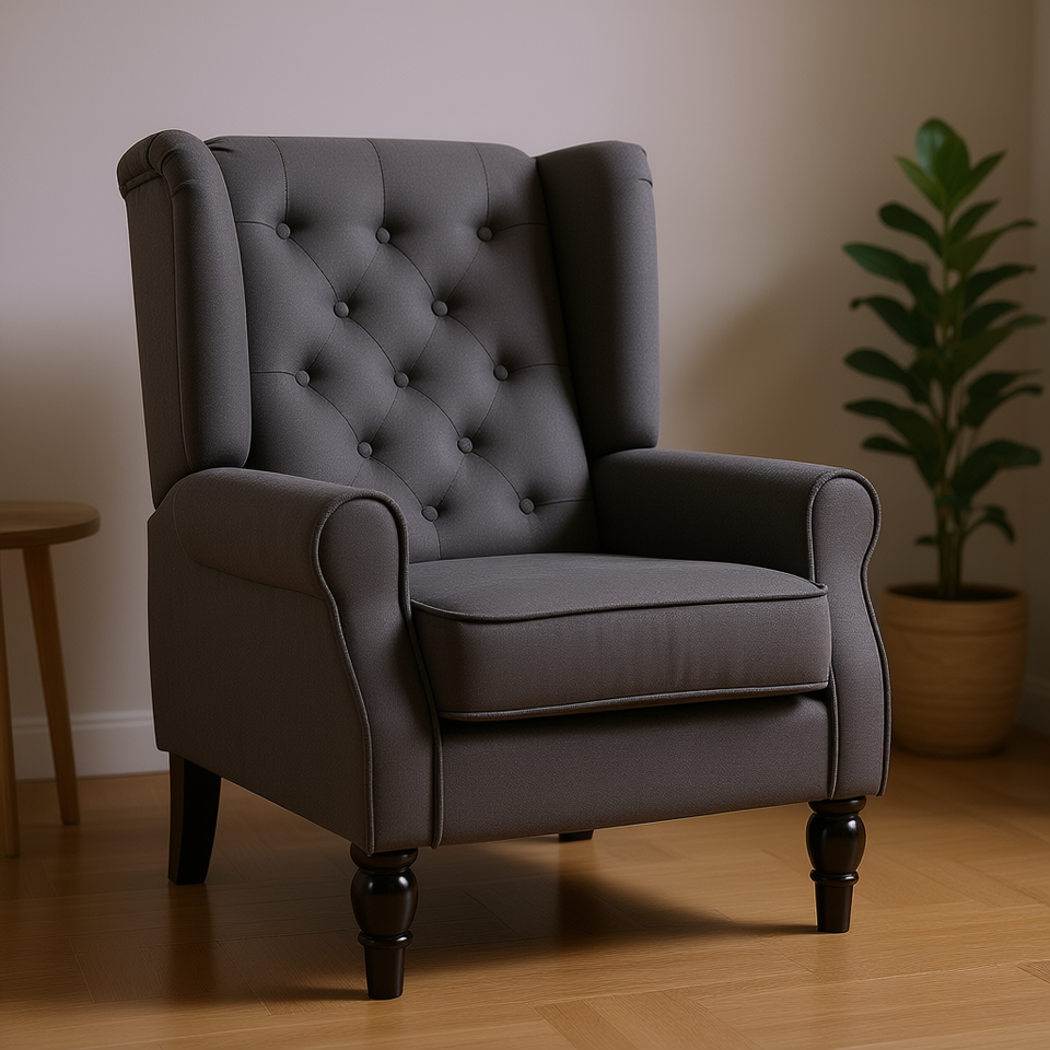เก้าอี้พักผ่อนสีเทาเข้มแบบมีพนักพิงทรงกระบอก ขาไม้ เฟอร์นิเจอร์ห้องนั่งเล่น