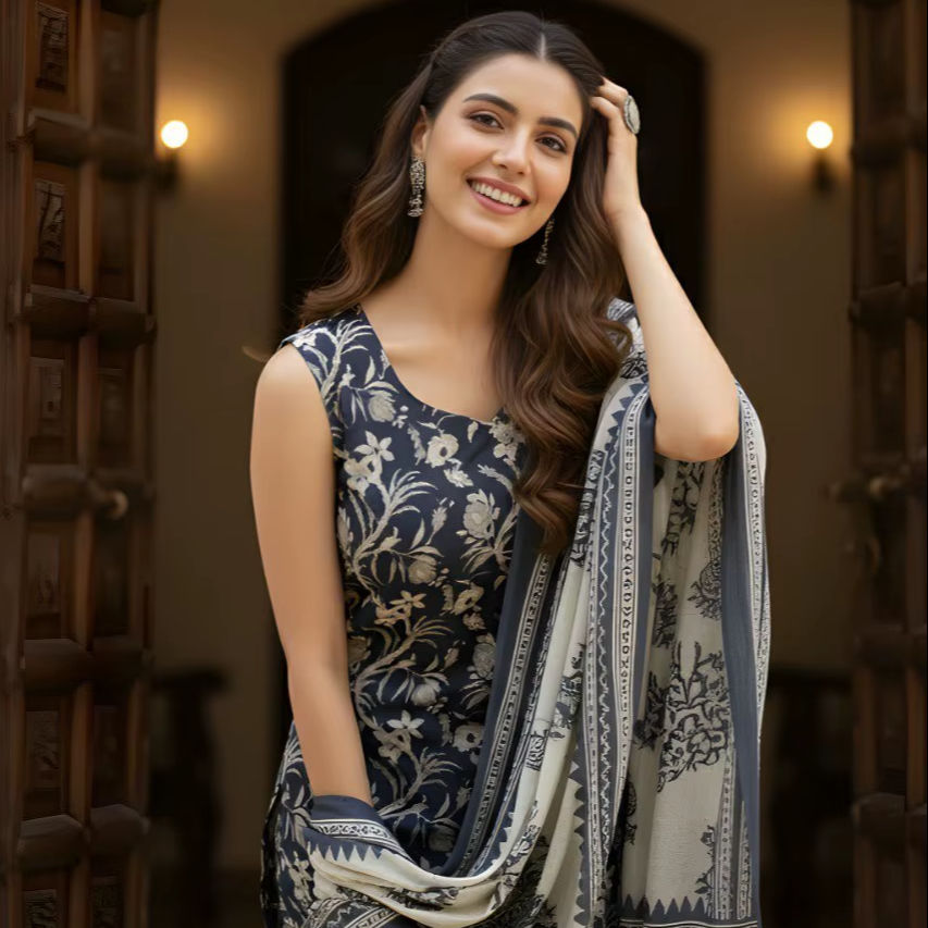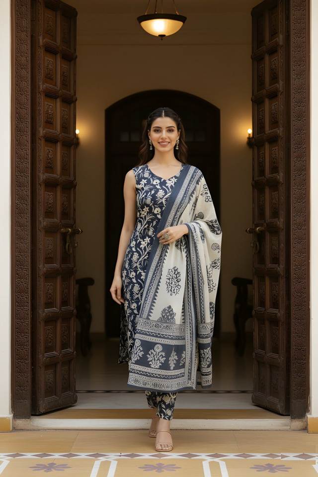 ชุดคุर्ตาผ้าฝ้ายสีเทาเข้มพร้อมกางเกงและผ้าคลุมไหล่สำหรับผู้หญิง ตัดเย็บสำเร็จ ผ่าข้าง ทรงตรง ขายส่ง มีสินค้าพร้อมส่ง