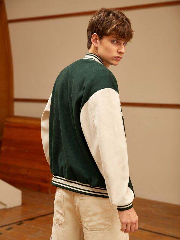 เสื้อแจ็คเก็ตผ้าฝ้ายแบบมีซิปด้านหน้าสำหรับผู้ชายเสื้อทีมโรงเรียนเบสบอลวิทยาลัยสีเขียวเข้มแขน100% สีเบจสีตัดกัน