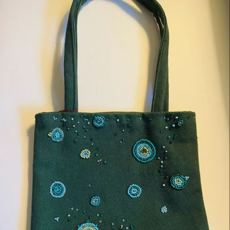 กระเป๋าผ้าเดนิมสีเขียวเข้ม กระเป๋าถือลายปักลูกปัดสีน้ำเงิน กระเป๋าสะพายผ้าฝ้าย กระเป๋าสะพายไหล่ผู้หญิง ใช้ในชีวิตประจำวัน กระเป๋าลำลอง