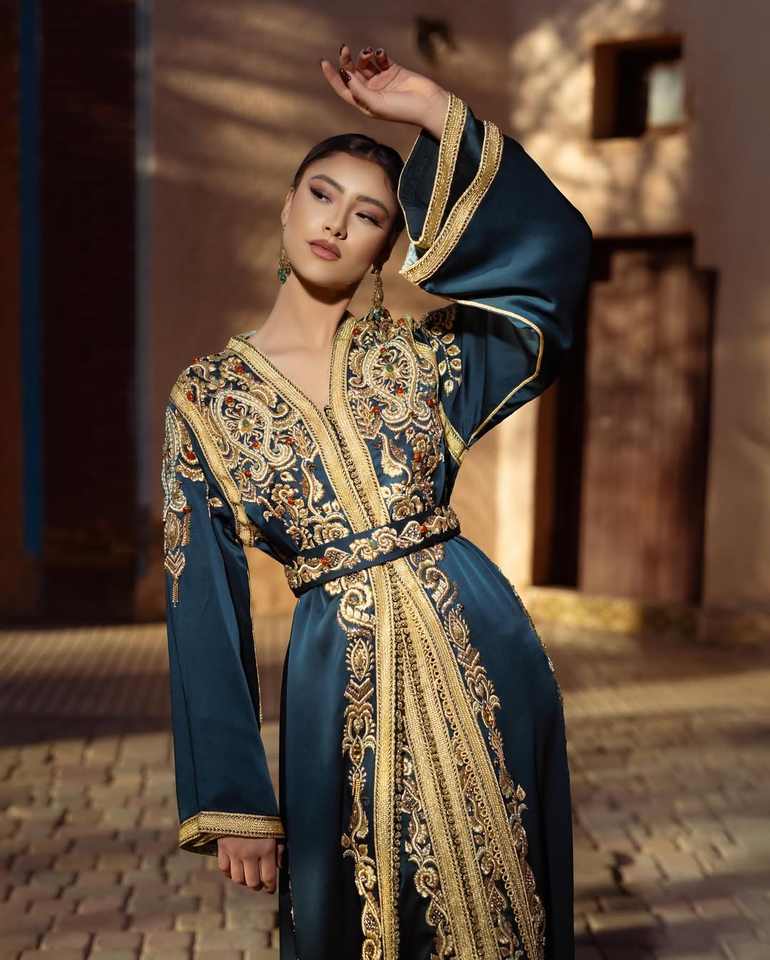 ผ้าซาตินสไตล์โมร็อกโกคาฟตันทำด้วยมือสีเขียวเข้มมีคุณสมบัติระบายอากาศป้องกันไฟฟ้าสถิตย์สไตล์ลำลองลำลองแบบดั้งเดิม