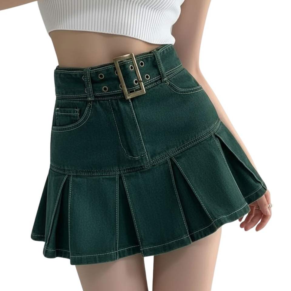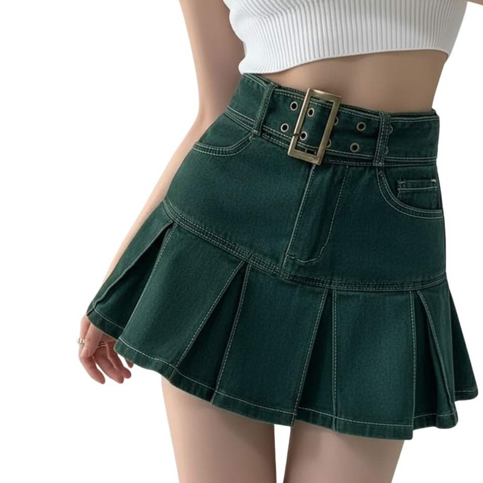 กระโปรงยีนส์สั้นทรงเอวสูงสีเขียวเข้ม จีบระบาย ความยาวระดับเข่า สำหรับผู้หญิง สวมใส่ในฤดูร้อน รับสกรีนโลโก้