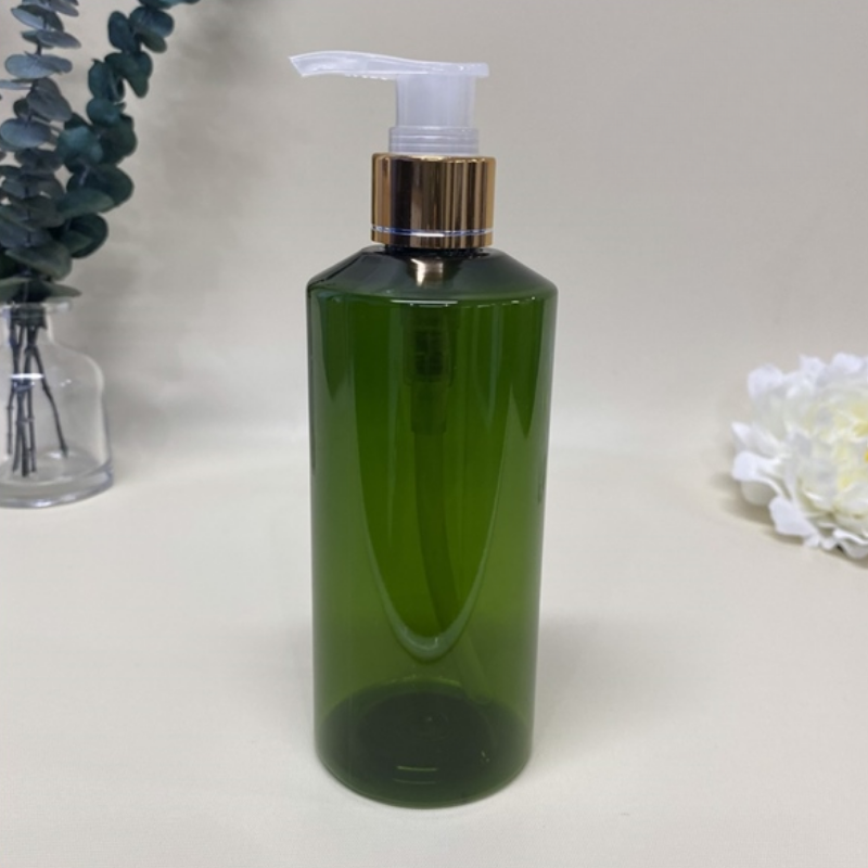 ขวด PET สีเขียวเข้มพร้อมโลโก้ไหล่เอียงขวด300มล.-24มม.-29กรัมสำหรับคลีนเซอร์หน้าและครีมเครื่องสำอาง