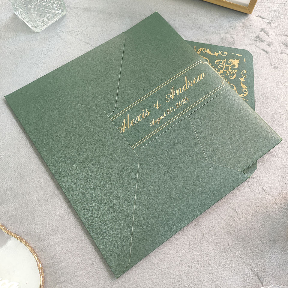 รวมถึง:กระเป๋าสามพับ + การ์ดอะคริลิก + การ์ด RSVP + ซองจดหมาย + สายรัดหน้าท้อง