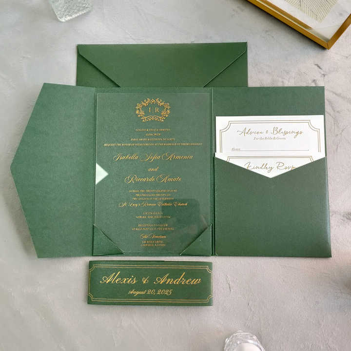 ชุดการ์ดเชิญงานแต่งงานแบบแข็งสีเขียวเข้ม พับสามตอน ดีไซน์หรูหรา พร้อมการ์ดอะคริลิกใส และการ์ดตอบรับ งานแต่งงานสุดหรู ทันสมัย