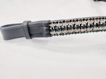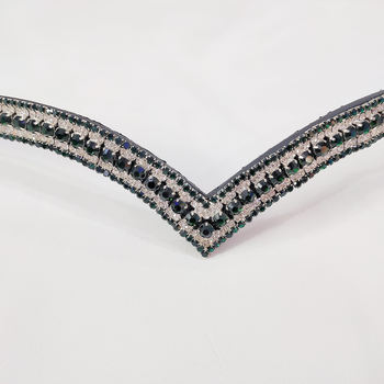 สายคาดหน้าผากม้าหนังอิตาลีสีเขียวเข้มและสีขาวประดับคริสตัลรูปตัววี อุปกรณ์ขี่ม้าคุณภาพพรีเมียมสำหรับการแสดง